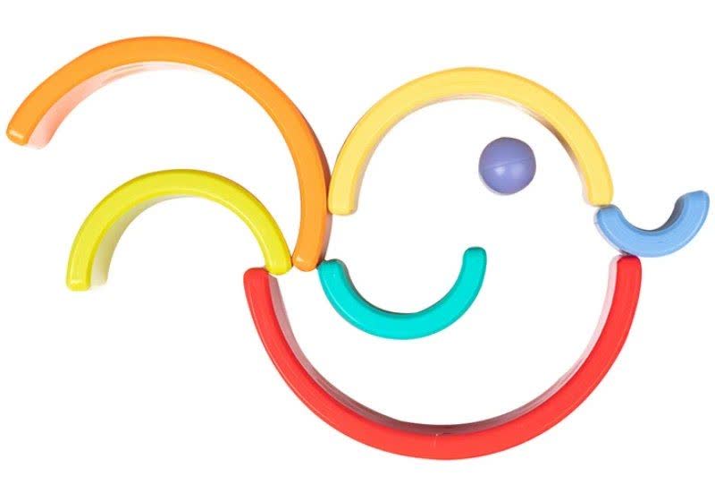 - قطعات رنگینکمان قابل مرتبسازی: بخش بالایی دارای اسلاتهایی برای قرار دادن قوسهای رنگینکمان است، که به کودک در یادگیری تشخیص رنگ، ترتیب اشیا و اندازهها کمک میکند.
