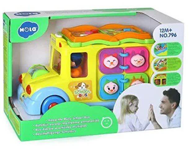 اسباب بازی اتوبوس آموزشی هولی تویز (Hola Toys Keep Me Busy School Bus 796) یک اتوبوس آموزشی و موزیکال مناسب کودکان نوپا است که ترکیبی از سرگرمی تعاملی، نور و صدا را ارائه میدهد. این اتوبوس وقتی حرکت میکند، مسیرش را تغییر میدهد، و کودک را ترغیب میکند آن را دنبال کند. روی اتوبوس، صفحات قابل چرخاندن وجود دارد که با هر برگرداندن آنها، صداهای حیوانات (حدود ۱۰ صدا) پخش میشود. همچنین دکمهها، چرخدندهها، زنگ درب و چرخدندههای رنگی برای بازی فکری در اختیار کودکاند. چراغ چشمکزن همراه با موزیکرتجربهای چندحسی برای کودک ایجاد میکند. این اسباببازی برای کودکان از حدود ۱۲ ماه به بالا مناسب است. با این اتوبوس، کودک علاوهبر لذت بردن از بازی، مهارتهایی مثل هماهنگی دست و چشم، درک علت و معلول، و شناخت صدا و حیوانات را توسعه میدهد.