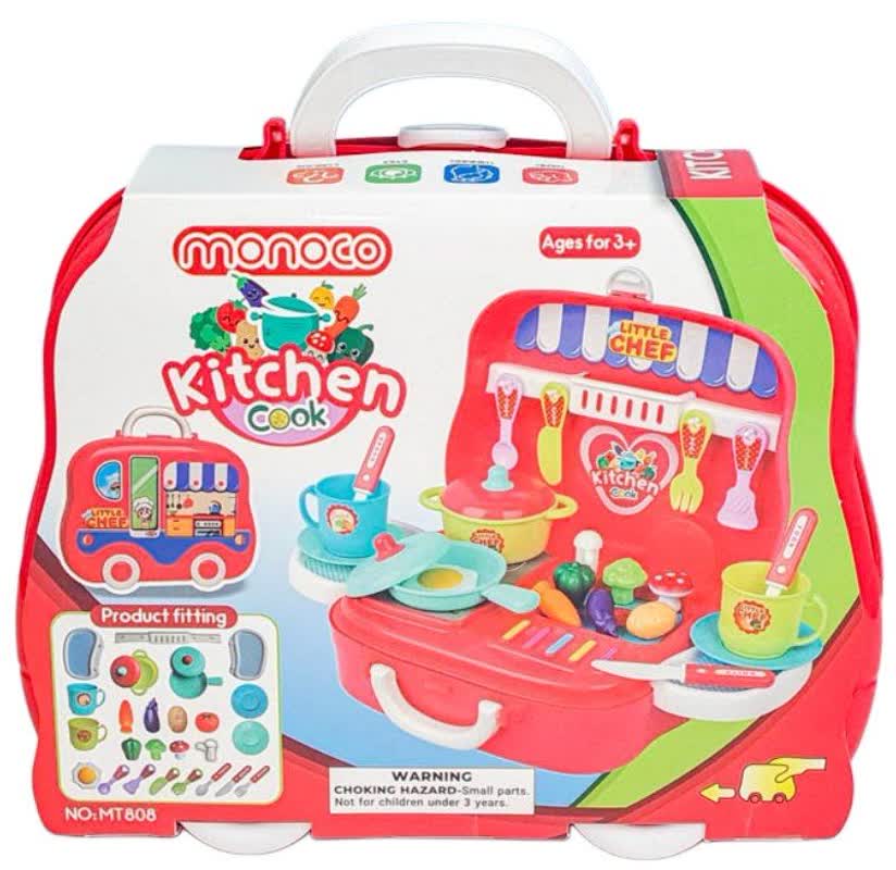 اسباب بازی آشپزخانه چمدانی لیتل شف مونوکو Monoco Little Chef Set MT808 یک مجموعه سرگرم‌کننده و آموزشی برای سرآشپزهای کوچک است. این محصول با طراحی هوشمندانه به شکل یک چمدان چرخ‌دار قرمز رنگ عرضه می‌شود که حمل آن را برای کودکان بسیار آسان کرده و به راحتی به یک ایستگاه آشپزی کامل تبدیل می‌شود. نام تجاری این محصول Monoco Kitchen Cook است و برای کودکان بالای ۳ سال طراحی شده تا مهارت‌های حرکتی و اجتماعی خود را از طریق بازی‌های نقش‌آفرینی تقویت کنند. این ست شامل قطعات متنوعی نظیر اجاق گاز، قابلمه، تابه، قاشق، چنگال، چاقو، فنجان و انواع سبزیجات پلاستیکی با رنگ‌های بسیار شاد و جذاب است.
