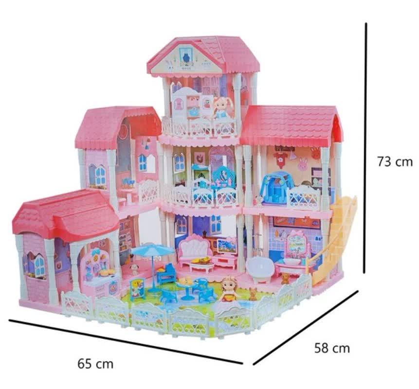 این خانه عروسکی دارای ابعاد قابل توجهی است که حضور آن در اتاق کودک جلوهای خاص میبخشد. طبق مشخصات فنی، ارتفاع این سازه ۷۳ سانتیمتر، طول آن ۶۵ سانتیمتر و عرض آن ۵۸ سانتیمتر است. این ابعاد بزرگ اجازه میدهد که چندین کودک به طور همزمان با آن بازی کنند و مهارتهای اجتماعی خود را ارتقا دهند.