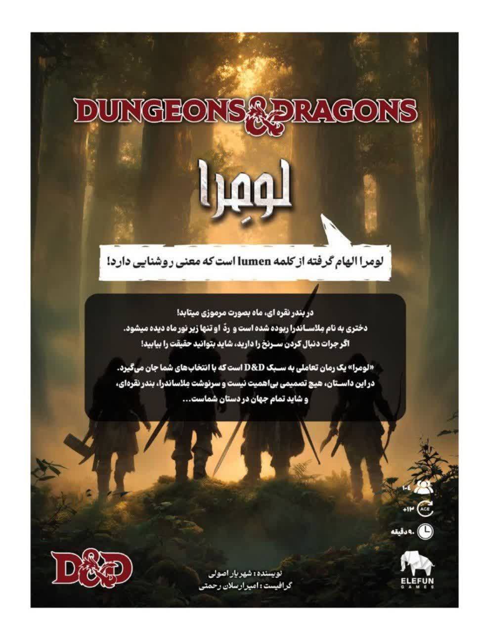 بازی  پرونده معمایی دانجنز اند دراگنز لومرا Dungeons & Dragons دروازه‌ای نو به دنیای پر رمز و راز دانجنز اند دراگنز (Dungeons & Dragons) است. این اثر که در سبک رمان تعاملی و به صورت یک بازی پرونده‌ای طراحی شده، شما را به "بندر نقره‌ای" می‌برد؛ جایی که ماه به شکلی مرموز می‌تابد و دختری به نام ملاساندرا ناپدید شده است. نام لومرا از واژه Lumen به معنای روشنایی الهام گرفته شده و در این مسیر تاریک، تنها انتخاب‌های شما هستند که نور حقیقت را می‌تابانند. این بازی برای ۱ تا ۴ بازیکن بالای ۱۳ سال طراحی شده و تجربه‌ای عمیق و داستانی به مدت بیش از ۹۰ دقیقه را ارائه می‌دهد. اگر از طرفداران سبک نقش‌آفرینی هستید و به دنبال داستانی می‌گردید که با هر تصمیم شما تغییر کند، لومرا منتظر شماست تا جرات دنبال کردن سرنخ‌ها را در زیر نور ماه داشته باشید.