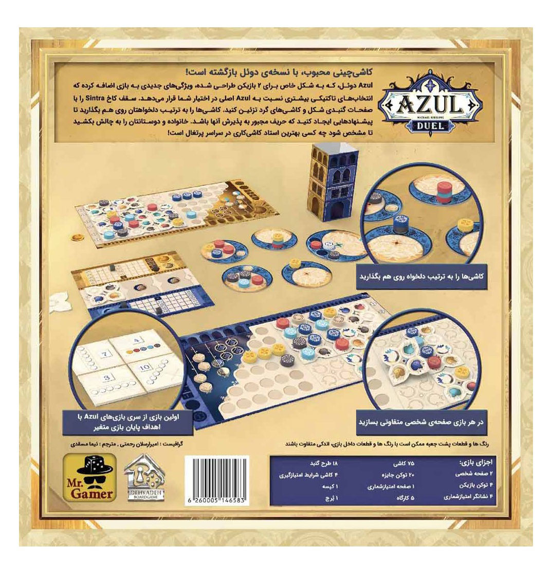 بازی فکری آزول دوئل (Azul Duel) نسخه‌ای هیجان‌انگیز و استراتژیک از سری محبوب Azul است که مخصوص ۲ بازیکن طراحی شده است. در این بازی، شما و رقیبتان به عنوان دو استاد کاشی‌کاری باید سقف قصر سینترا را با کاشی‌های زیبا تزئین کنید و نشان دهید که کدام‌یک برتر است. بازی از ۵ راند تشکیل شده است که در هر راند سه فاز (تصاحب، کاشی‌کاری گنبد و امتیازگیری، آماده‌سازی) اجرا می‌شود. بازیکنی که بیشترین امتیاز را تا پایان راند پنجم کسب کند، برنده خواهد بود. زمان متوسط بازی حدود ۴۵ دقیقه است. این نسخه علاوه بر لذت بازی، فضایی برای تصمیم‌گیری تاکتیکی و رقابت فکری فراهم می‌کند و مناسب افرادی است که دنبال تجربه‌ای استراتژیک و زیبا در جمع دو نفر هستند.