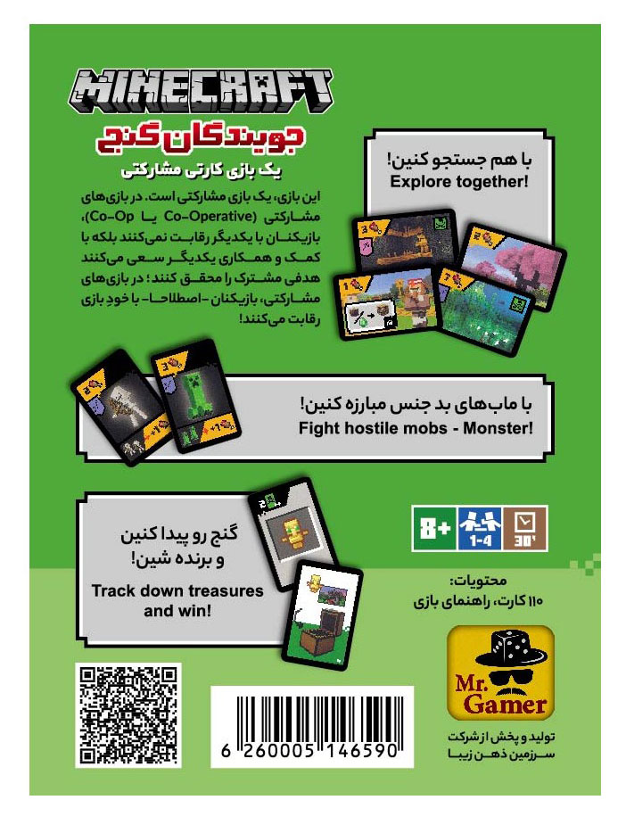 بازی فکری کارتی ماینکرافت جویندگان گنج Minecraft Explorers برگرفته از دنیای بیپایان Minecraft طراحی شده و تجربهای جذاب و گروهی را برای بازیکنان فراهم میکند. این بازی به صورت همکاری و مشارکتی انجام میشود و شما و دوستانتان باید برای پیدا کردن گنجها و پر کردن صندوقها تلاش کنید. اما مراقب باشید! چرا که مابها مثل زامبی، اسکلت، عنکبوت و کریپرها در کمین هستند. این بازی برای ۱ تا ۴ بازیکن طراحی شده و زمان تقریبی هر دست بین ۳۰ تا ۴۰ دقیقه است. بازیکنان در جریان بازی باید با انتخاب استراتژی درست، جستجو در زیستگاهها، مبارزه با مابها و پر کردن صندوقها، سرنوشت خود را رقم بزنند. اگر صندوقهای کافی پر شوند، شما برنده خواهید شد، اما اگر کارت پایان بازی رو شود، بازی به پایان میرسد.