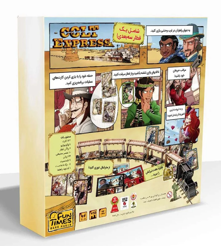 اگر به دنبال یک بازی رومیزی خانوادگی با هیجان، خنده و استراتژی هستید، بازی فکری کلت اکسپرس Colt Express بهترین انتخاب شماست. این بازی در سال 2015 بهعنوان بهترین بازی دنیا (Spiel des Jahres) انتخاب شد و نسخه ایرانی آن توسط گروه Fun Times عرضه میشود. وجود یک قطار سهبعدی جذاب باعث میشود که بازیکنان تجربهای واقعیتر از راهزنی در غرب وحشی داشته باشند.