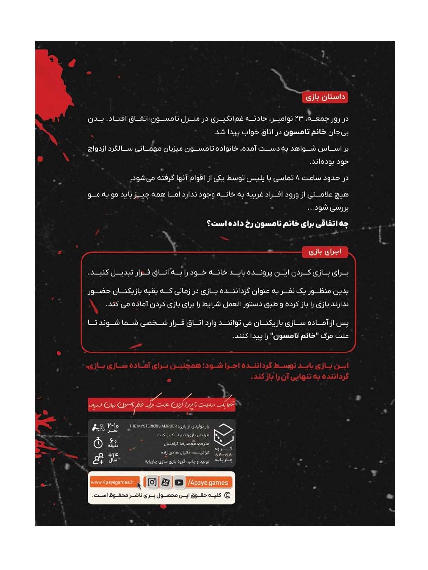 بازی معمایی پرونده قتل مرموز (Mysterious Murder) یک تجربه هیجانانگیز در دنیای بازیهای کارآگاهی است، که شما و همراهانتان را وارد صحنهٔ جنایتی مرموز میکند.باید مدارک، عکسها و سرنخها را بررسی کنید، فرضیه بسازید و نهایتاً عامل قتل را شناسایی نمایید. این بازی مناسب نوجوانان و بزرگسالان است و زمانی تقریباً ۹۰ تا ۱۲۰ دقیقه برای حل معما توصیه میشود.اگر به دنبال سرگرمی گروهی با چالش ذهنی بالا و فضای داستانی جذاب هستید، پرونده قتل مرموز انتخابی بسیار مناسب برای دورهمیهای دوستانه یا خانوادگی شما خواهد بود.