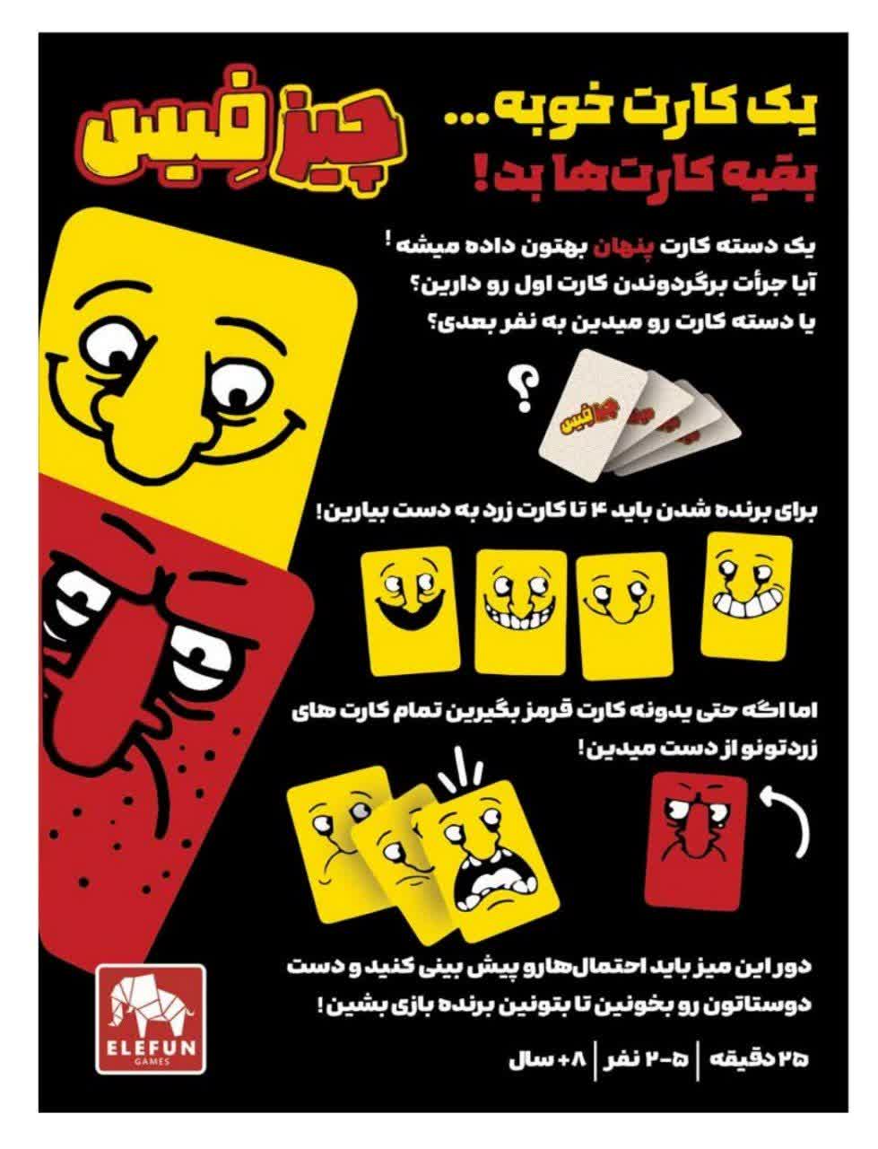 بازی چیزفیس Chiz Face یک بازی کارتی سریع، مینیمال و بهشدت اعتیادآور است که بر اساس بازی مشهور خارجی Good Face Bad Face طراحی شده است. در این بازی، مرز باریکی بین شجاعت و حماقت وجود دارد! شعار بازی ساده است: «یک کارت خوبه، بقیه کارتها بد!». شما با یک دسته کارت پنهان روبرو هستید و باید تصمیم بگیرید که آیا جرئت رو کردن کارت اول را دارید یا ترجیح میدهید خطر را به نفر بعدی منتقل کنید؟. هدف شما جمعآوری کارتهای زرد (صورتهای خندان) است، اما یک کارت قرمز (صورت اخمو) کافی است تا تمام زحماتتان به باد برود. این بازی برای ۲ تا ۵ نفر طراحی شده و در حدود ۲۵ دقیقه زمان میبرد؛ انتخابی عالی برای تقویت هوش هیجانی و مهارتهای بلوفزنی در جمعهای دوستانه.