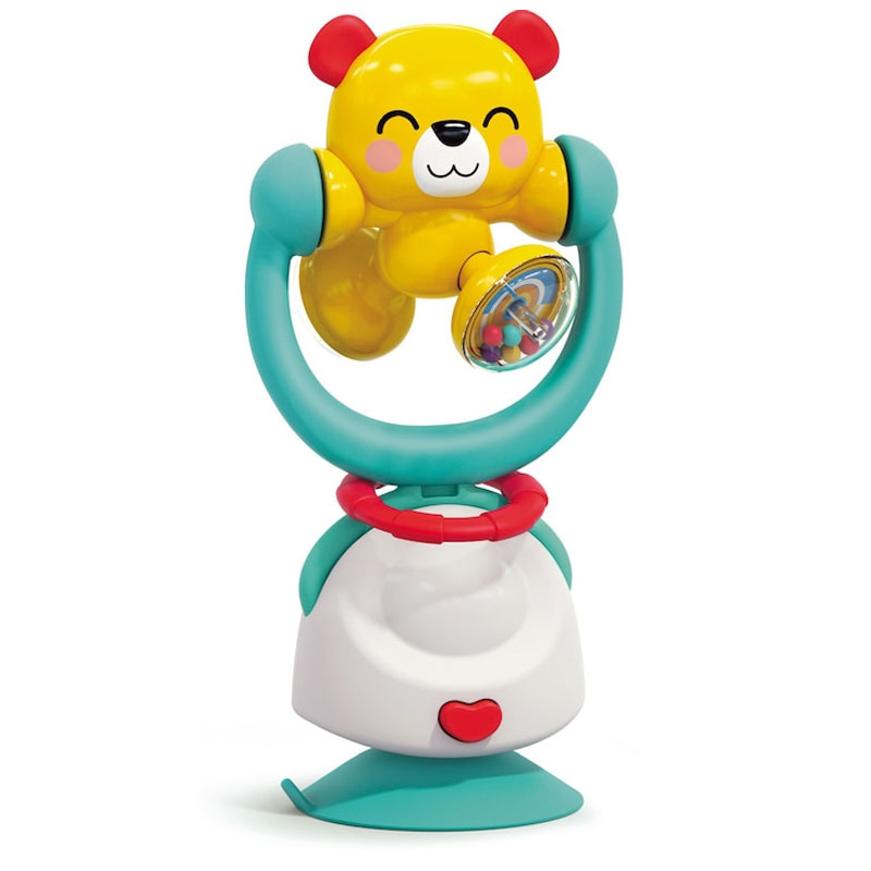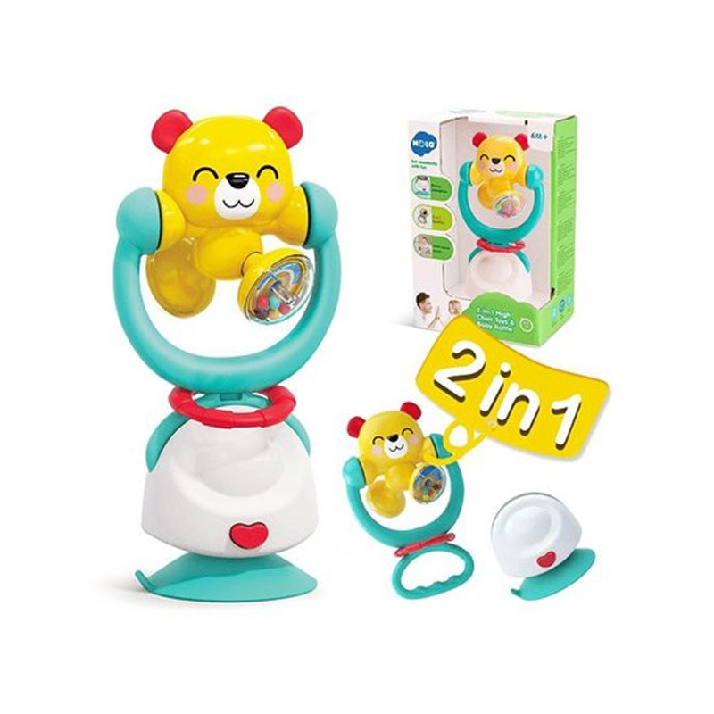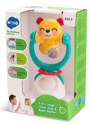 جغجغه دو کاره خرس هولی تویز (Hola Toys 2 in 1 High Chair Toys and Baby Rattle E7975ABC) این محصول با طراحی منحصر به فرد خود، علاوه بر سرگرم کردن کودک، به رشد و تقویت مهارت‌های مختلف او نیز کمک می‌کند. این جغجغه 2 کاره است هم می توانید آن را با پایه مکنده روی میز یا صندلی نصب کنید و هم با یک دکمه بخش بالایی را جدا کنید تا تبدیل به یک جغجغه دستی و دندانگیر برای کودک شود. بازی با این جغجغه باعث رشد و تقویت مهارت های حرکتی، تقویت بینایی از طریق تماشای رنگ های شاد و افزایش خلاقیت کودک میشود.