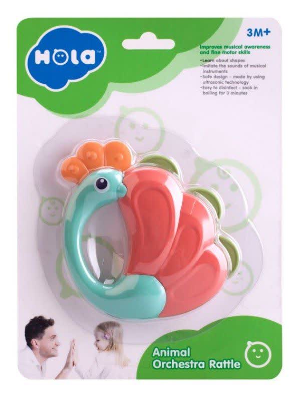 جغجغه طرح طاووس کودک هولی تویز (Hola Toys Animal Orchestra Rattle Peacock E318B) این محصول با طراحی منحصر به فرد خود، علاوه بر سرگرم کردن کودک، به رشد و تقویت مهارتهای مختلف او نیز کمک میکند. جغجغه هالی تویز با رنگهای شاد و متنوع، توجه کودک را جلب کرده و حس بینایی او را تحریک میکند. صداهای ملایم و دلنشین جغجغه نیز حس شنوایی کودک را تقویت کرده و به آرامش او کمک میکند. طراحی این جغجغه کاملا ایمن و بی خطر است و برای نوزادان تازه متولد شده تجربه ای دوست داشتنی، شادی آور، و بسیار سرگرم کننده می سازد. طراحی ارگونومیک این اسباب بازی به کودک کمک میکند تا به راحتی آن را در دست بگیرد و با آن بازی کند.