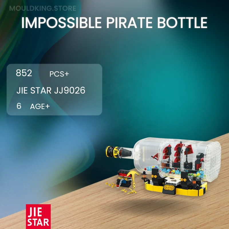 مجموعهٔ Impossible Pirate Bottle JJ9026 شامل ۸۵۲ قطعه ABS است که با دقت طراحی شدهاند تا کشتی داخل بطری را با جزئیات مناسب نمایش دهند. کشتی دارای بادبانها، عرشهٔ چوبی، دکل، تیرکها و جزئیات دریایی است. بطری شفاف است و پایهای دارد که بطری روی آن ثابت قرار میگیرد. ابعاد تقریباً ۳۱٫۶ × ۱۲٫۴ × ۱۳٫۴ سانتیمتر پس از ساخت کامل است. رنگها طبیعی و طراحی بافتهای چوبی و تفصیل کشتی به گونهای است که حس اصالت به مدل میدهد.