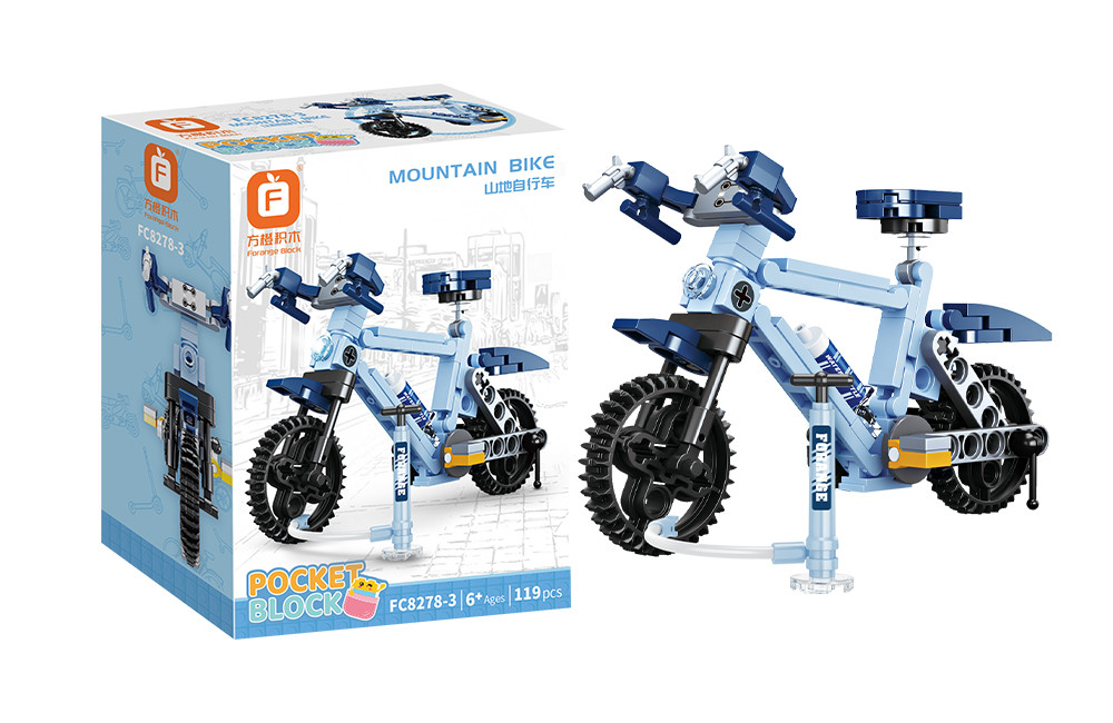 لگو دوچرخه کوهستان آبی Vehicle Mountain Bike FC8278-3 یک مدل جذاب و فانتزی از سری وسایل نقلیه فورنج بلاک است که شامل ۱۱۹ قطعه با رنگ آبی می‌شود و یک تلمبه لگویی کوچک نیز همراه آن ارائه شده است. طراحی دقیق چرخ‌ها، فرمان و بدنه، تجربه مونتاژ و بازی واقعی یک دوچرخه کوهستان کوچک را فراهم می‌کند. این لگو علاوه بر سرگرمی و بازی، می‌تواند به‌عنوان قطعه دکوری فانتزی روی میز یا ویترین استفاده شود. مونتاژ این مدل باعث تقویت تمرکز، صبر و مهارت‌های دست‌ورزی کودکان و بزرگسالان می‌شود و تجربه آموزشی همراه با تفریح را ارائه می‌دهد.