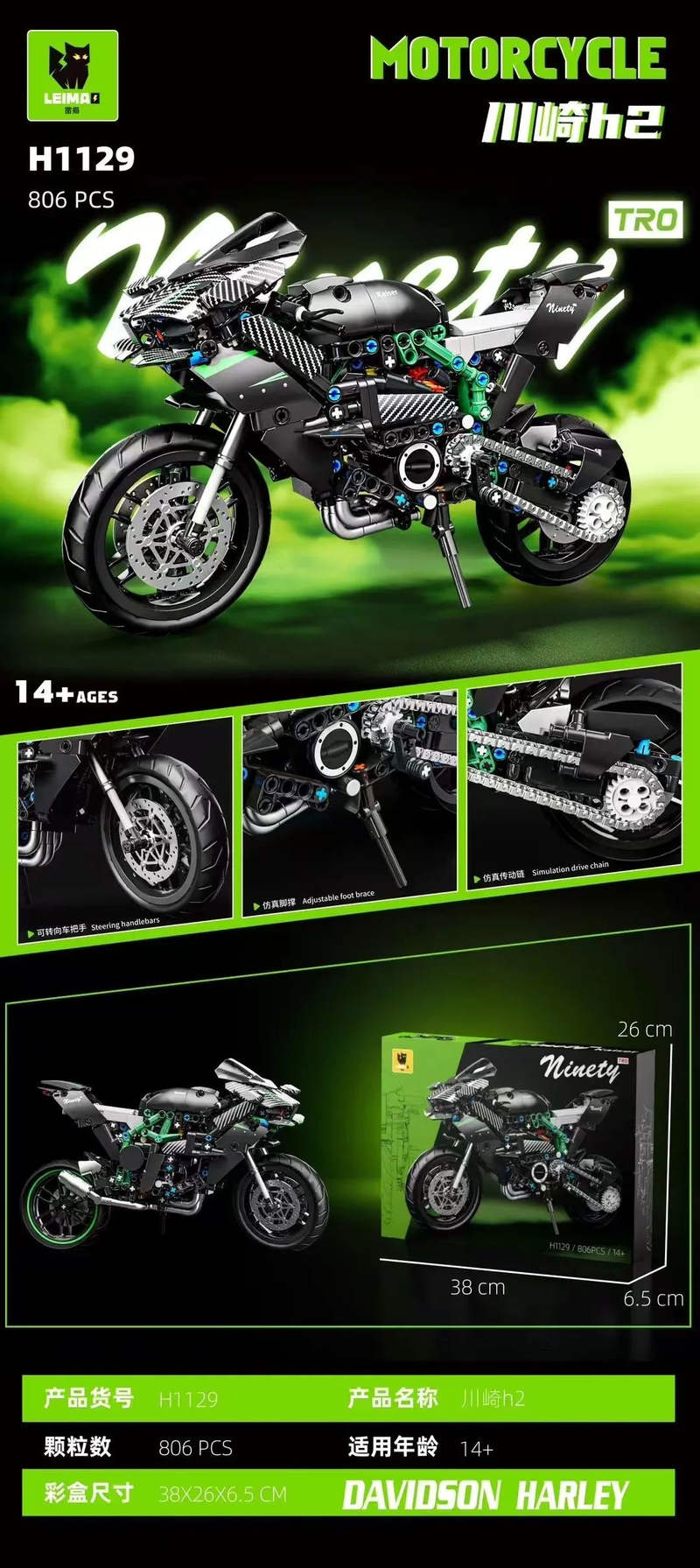 لِگو بلوک ساختنی موتورسیکلت ناینتی کایزر H1129 (LEIMA Ninety Kaiser Motorcycle H1129) یک مجموعه بلوکی دقیق و زیبا است که با ۸۰۶ قطعه طراحی شده و مناسب ساخت مدلی از یک موتورسیکلت کلاسیک است. این ست برای کسانی طراحی شده که هم به ساختن با بلوکهای سازنده علاقه دارند و هم عاشق موتورسواری و طراحی صنعتی هستند. پس از مونتاژ، مدل بهصورتی واقعگرایانه دارای بدنه، چرخها، فرمان، موتوری بلوکی و جزئیات بیرونی خواهد بود که میتوان آن را بهعنوان اسباببازی، پروژه ساختنی یا مدل دکوری استفاده کرد. این موتورسیکلت بلوکی میتواند تجربه ساخت لذتبخش و آموزشی برای نوجوانان یا بزرگسالان باشد و مناسب کسانی است که دنبال ترکیب خلاقیت، مهارت دستی و علاقه به موتور هستند.
