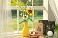 - گلدان زرد مدرن: طراحی ساده اما شیک که با رنگ گلها هماهنگی کامل دارد.