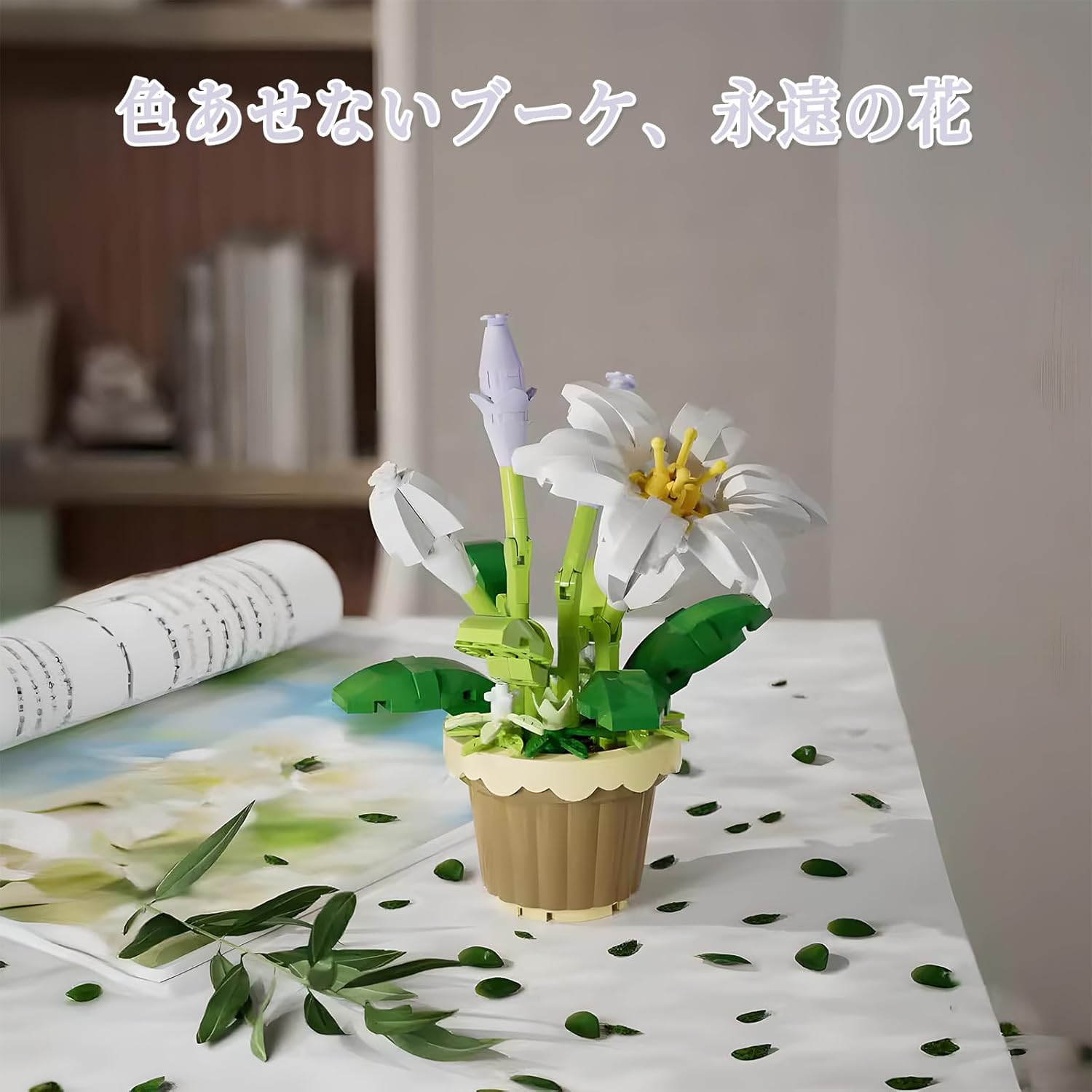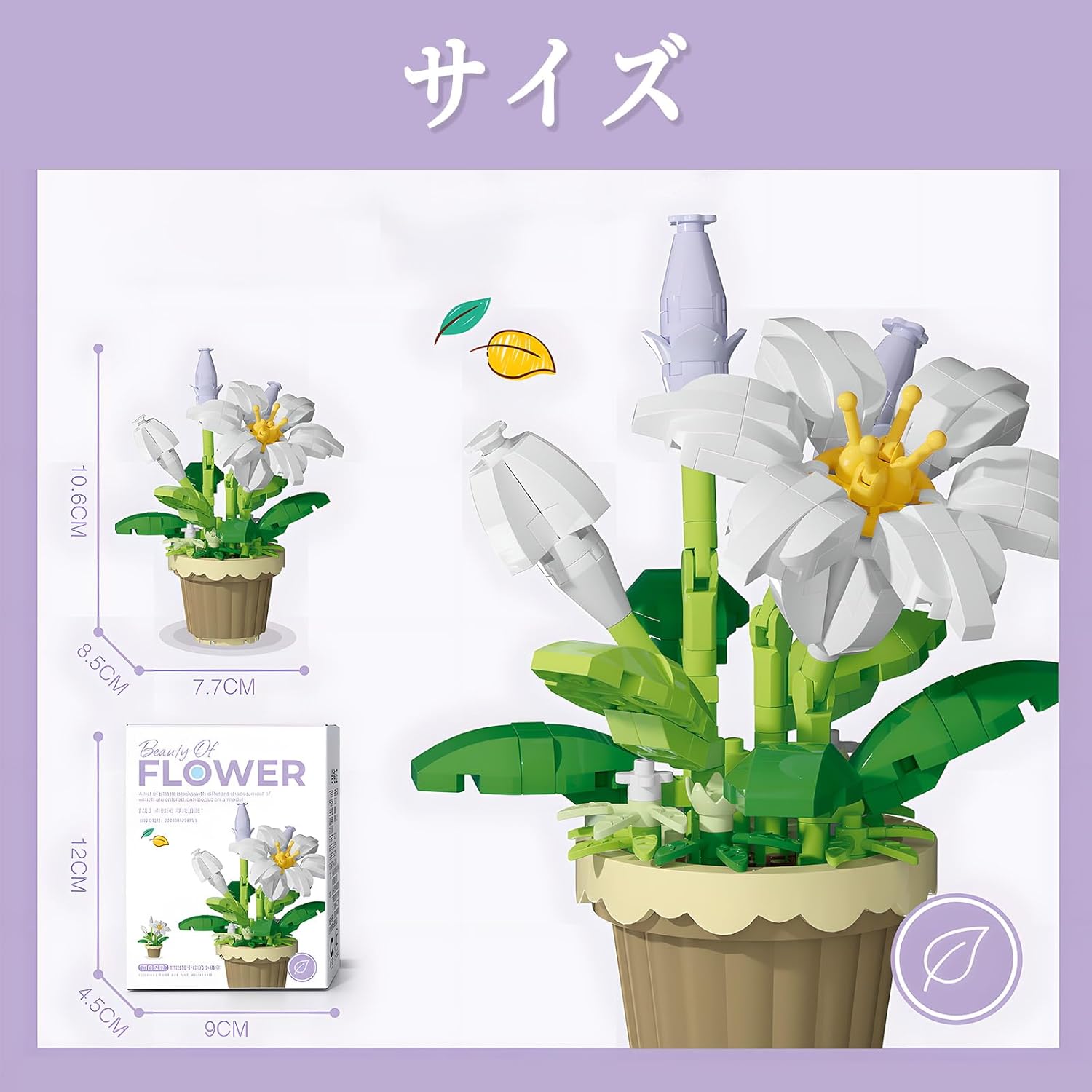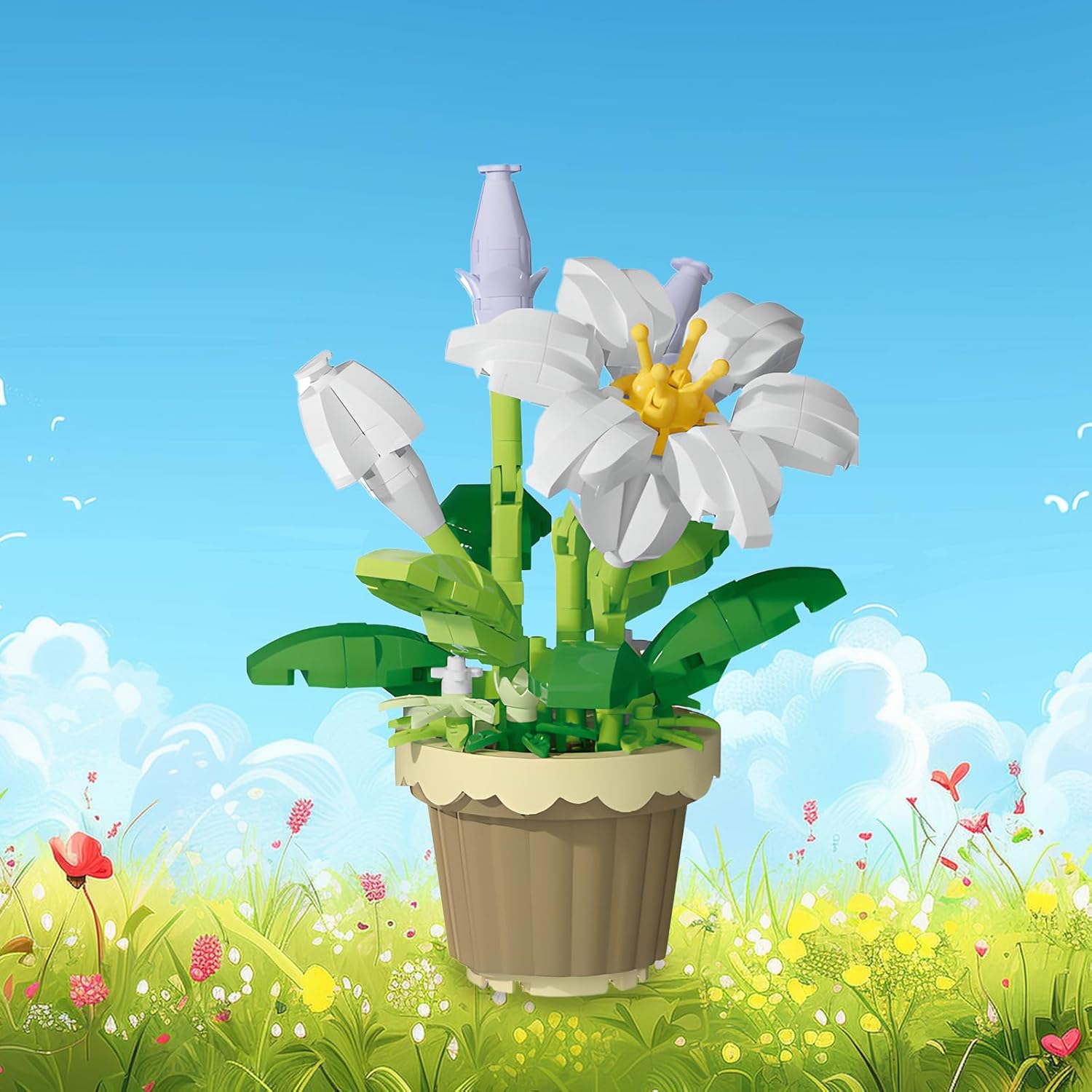 این مجموعه با بلوک‌هایی طراحی شده که پس از مونتاژ به یک گلدان گل سوسن زیبا تبدیل می‌شود. گلبرگ‌ها شکل هنری دارند و برگ‌ها و ساقه با جزئیات متناسب طراحی شده‌اند تا محصول نهایی حس طبیعی بودن داشته باشد. طراحی رنگ‌ها معمولاً شامل سفید ملایم، صورتی کم‌رنگ، سبز برگ و رنگ‌هایی هماهنگ با سبک گل سوسن است.