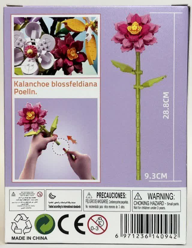 لگو گل کالانکوئه بلاسفلدیانا پولن Kalanchoe Blossfeldiana Poelln Flower 087G1 که برای کودکان بالای ۶ سال طراحی شده است. این محصول ترکیبی از اسباببازیهای سازهای و زیباییهای گلهای طبیعی است؛ به این معنا که کودکان میتوانند با قطعات مختلف، یک ماکت زیبا و سهبعدی از گل کالانکوئه بسازند که بعد از کامل شدن ارتفاع آن ۲۸.۵ سانتیمتر و عرض آن ۹.۳ سانتیمتر میباشد. این کار نه تنها سرگرمی خلاقانه برای کودکان است، بلکه باعث تقویت هماهنگی دست و چشم، تمرکز و مهارت حل مسئله میشود. طراحی این لگو با الهام از گل کالانکوئه واقعی (که یک گیاه محبوب زینتی با گلهای رنگارنگ است) باعث جذابیت بیشتر آن شده و میتواند به عنوان دکوری زیبا پس از ساخت نیز استفاده شود.