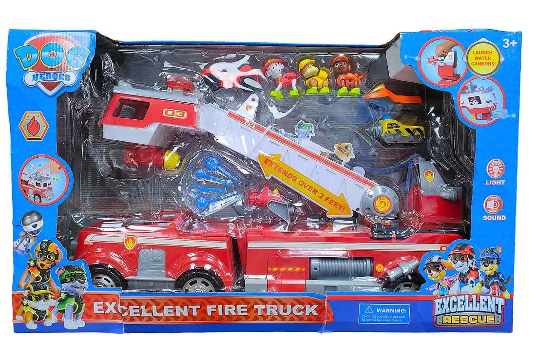 اسباب بازی ماشین آتشنشانی سگ های نگهبان تیرانداز Paw Patrol Dog Heroes Excellent Fire Truck 21251 یکی از اسباب بازی های جذاب از مجموعه سگ نگهبان می باشد. درون بسته بندی یک ماشین بزرگ قرمز، سه شخصیت از سگ های نگهبان به همراه وسایل نقلیه شخصی هرکدام از آن ها و 4 تیر پرتابی وجود دارد. طول ماشین آتش نشانی 62 سانتیمتر می باشد و به صورت دو تکه طراحی شده است. قسمت بالایی که به فرم نردبان امداد است به قسمت سرنشین کامیون متصل می باشد. این نردبان به صورت چند تکه طراحی شده است و طول آن تا 60 سانتیمتر می رسد. در قسمت پایین جایگاه سرنشینان محلی قرار دارد که تیرهای پرتابی درون آن قرار گرفته و پرتاب می شوند. دیگر محلی که برای پرتاب تیر تعبیه شده است، در قسمت پشتی ماشین می باشد که این موضوع جذابیت اسباب بازی را دو چندان می کند. عملکردهای متنوع این ماشین باعث می شود تا کودکان بتوانند ساعت ها به بازی با آن مشغول شوند.