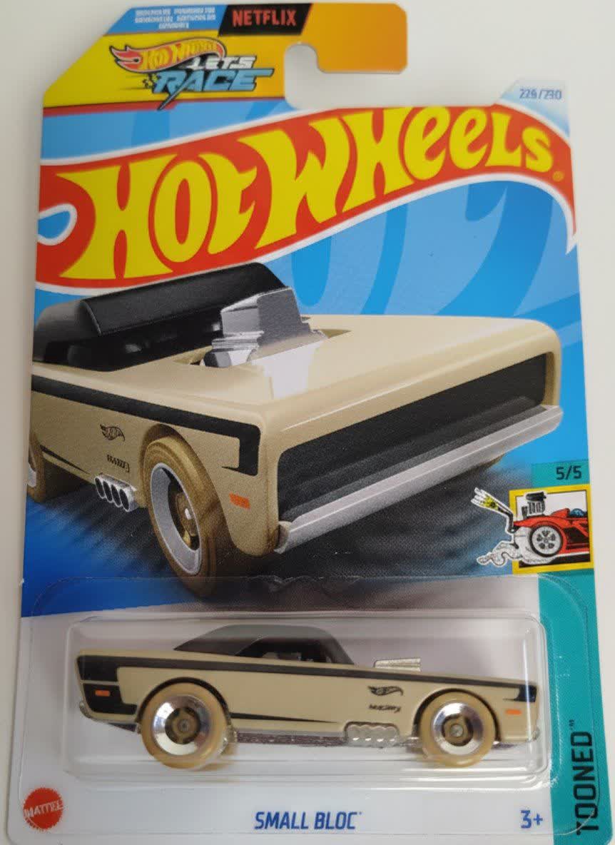 ماشین فلزی هات ویلز اسمال بلاک کارتونی Small Bloc به عنوان پنجمین و آخرین مدل از سری ۵ تایی Tooned در سال ۲۰۲۵ عرضه شده است. طراحی این ماشین در سبک "Tooned" انجام شده؛ یعنی بدنه آن فشرده، چاق و اغراقآمیز است. رنگ بدنه کرم/بژ با سقف مشکی و خطوط مسابقهای مشکی در کنارهها، ظاهری کلاسیک و سنگین به آن داده است. اما مهمترین ویژگی آن، موتور کرومی بزرگی است که از کاپوت بیرون زده و اگزوزهای جانبی که قدرت آن را به رخ میکشند. این مدل همچنین دارای لوگوی "Netflix Let's Race" است که نشان میدهد در ماجراجوییهای جدید هات ویلز حضور دارد.