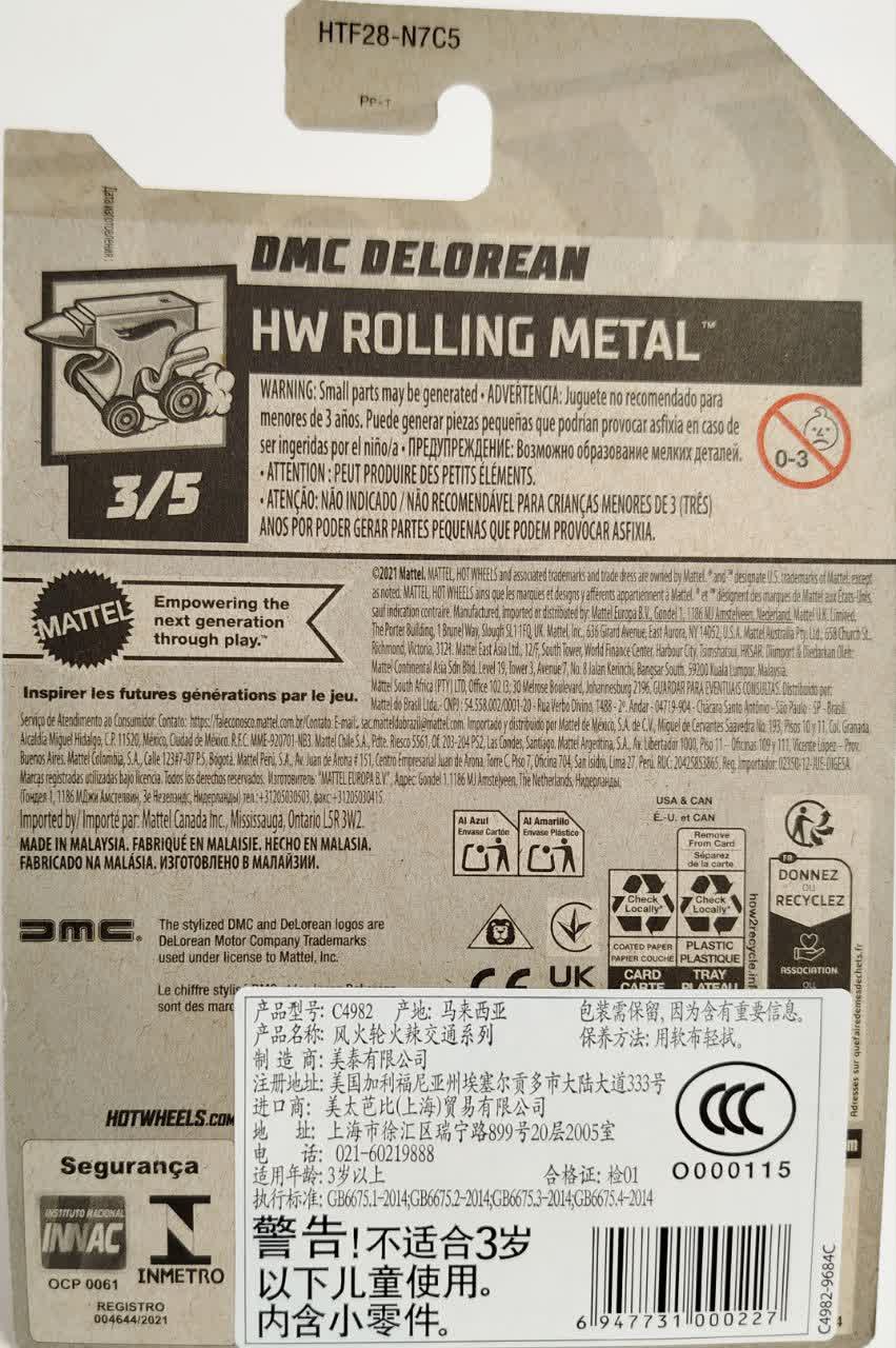 این مدل شماره ۳ از ۵ در سری HW Rolling Metal است. این سری جدید به خودروهایی اختصاص دارد که زیباییشان در بدنه فلزی و رنگهای متالیک آنهاست. دلورین به دلیل اینکه در واقعیت هم رنگ نمیشد و بدنه استیل داشت، بهترین و منطقیترین انتخاب برای این سری است. لوگوی این سری با تصویر یک ماشین فلزی در حال حرکت، در سمت راست کارت دیده میشود.