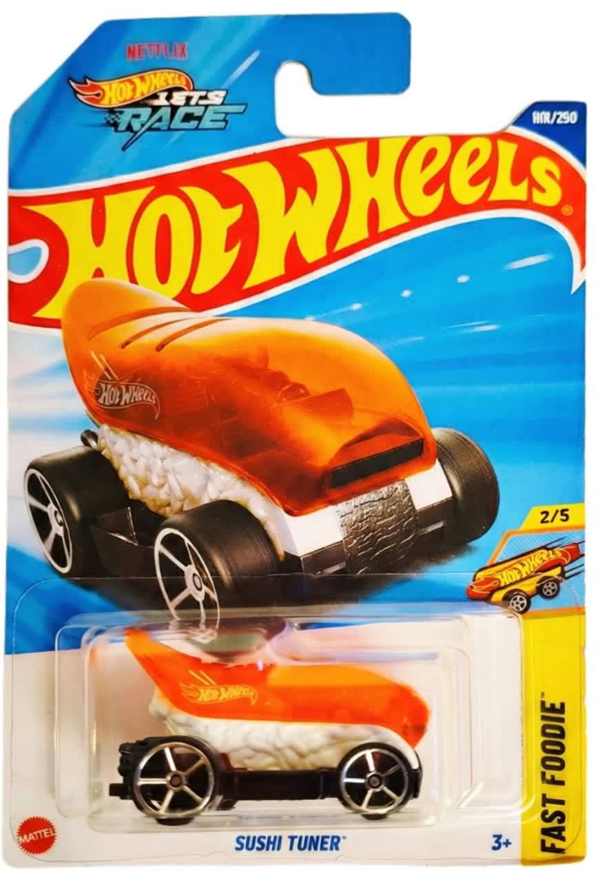 ماشین فلزی هات ویلز سوشی تونر Sushi Tuner که با کد کلکسیونی ۱۰۶/۲۵۰ و به عنوان دومین مدل از سری ۵ تایی Fast Foodie عرضه شده، شبیه به یک قطعه سوشی میگو طراحی شده است که روی چهار چرخ اسپرت حرکت میکند.قسمت بالایی ماشین از پلاستیک شفاف نارنجی رنگ ساخته شده که تداعیکننده میگو است و بخش میانی با بافت سفید، دانههای برنج را شبیهسازی میکند. پایه سیاه رنگ نیز نقش جلبک دریایی را بازی میکند. این طراحی خلاقانه باعث شده تا سوشی تونر یکی از محبوبترین مدلهای فانتزی هات ویلز باشد. وجود لوگوی انیمیشن "Netflix Let's Race" روی بستهبندی نشان میدهد که این سوشی پرسرعت در کارتونهای جدید نیز حضور دارد. اگر به دنبال هدیهای متفاوت و خندهدار هستید، این مدل بهترین انتخاب است.