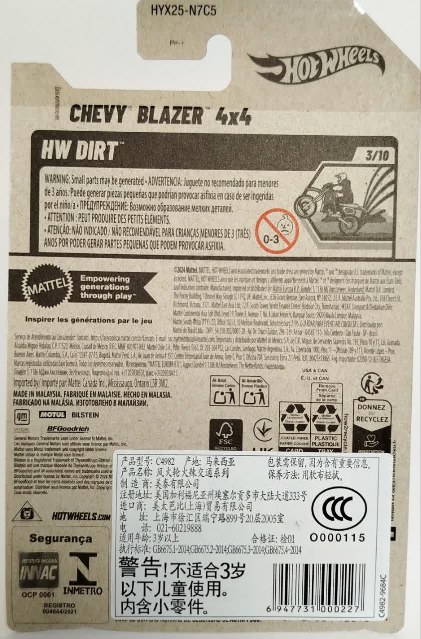 ماشین فلزی هات ویلز شورلت بلیزر چهار در چهار Chevy Blazer 4×4 با کد کلکسیونی ۸۱/۲۵۰ و به عنوان سومین مدل از سری ۱۰ تایی HW Dirt در سال ۲۰۲۵ عرضه شده است. طراحی این ماکت بر اساس نسل محبوب K5 بلیزر انجام شده است. بدنه سفید رنگ آن با خطوط مسابقهای کلاسیک آبی، نارنجی و قرمز تزیین شده که یادآور خودروهای رالی دهه ۸۰ میلادی است. عدد "404" روی دربها و کاپوت، به همراه لوگوی اسپانسرهای معروفی مثل BFGoodrich، MOTUL و BILSTEIN، حس یک خودروی مسابقهای حرفهای را منتقل میکند. باربند سقفی مشکی و گارد محافظ جلو، ظاهر خشن و آفرودی این بلیزر را تکمیل کردهاند.