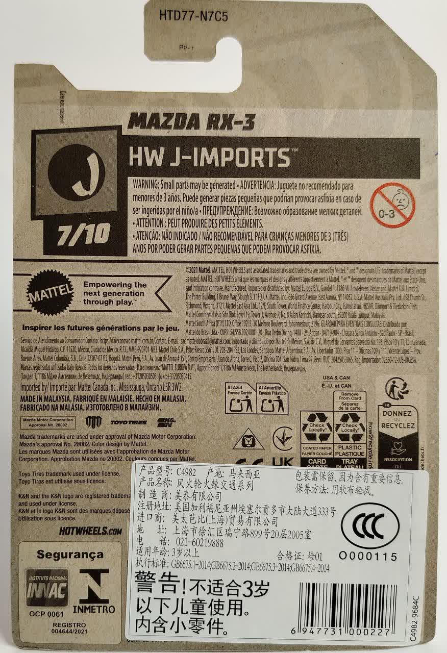این مدل شماره ۷ از ۱۰ در سری HW J-Imports است. این سری به خودروهای ژاپنی (JDM) اختصاص دارد که در سراسر جهان محبوبیت دارند. مزدا RX-3 با موتور وانکل خود یکی از اسطورههای این دسته است. لوگوی قرمز رنگ "J" که شبیه به یک مسیر دریفت یا جاده است، نماد این سری محبوب میباشد.