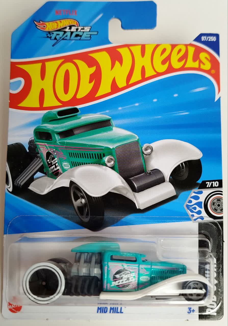 ماشین فلزی هات ویلز مید میل Mid Mill یک برداشت خلاقانه و جسورانه از خودروهای هات رود دهه ۳۰ میلادی است. این محصول با کد کلکسیونی ۹۷/۲۵۰ و به عنوان هفتمین مدل از سری ۱۰ تایی Rod Squad در سال ۲۰۲۵ عرضه شده است. نام "Mid Mill" به ویژگی فنی منحصر به فرد این ماشین اشاره دارد: "Mill" در اصطلاح ماشینبازها به معنی موتور است و "Mid" به معنی وسط؛ بنابراین با یک هات رود موتور وسط روبرو هستیم. بدنه این مدل به رنگ سبز فیروزهای (Teal) است که تضاد زیبایی با گلگیرهای پلاستیکی سفید رنگ و بزرگ آن ایجاد کرده است. موتور قدرتمند ۸ سیلندر با لولههای اگزوز کرومی که از پشت کابین بیرون زدهاند، ظاهری خشن و آماده برای مسابقه به آن داده است. وجود لوگوی "Netflix Let's Race" نشان میدهد که این مدل در انیمیشن جدید هات ویلز نیز نقشآفرینی میکند.