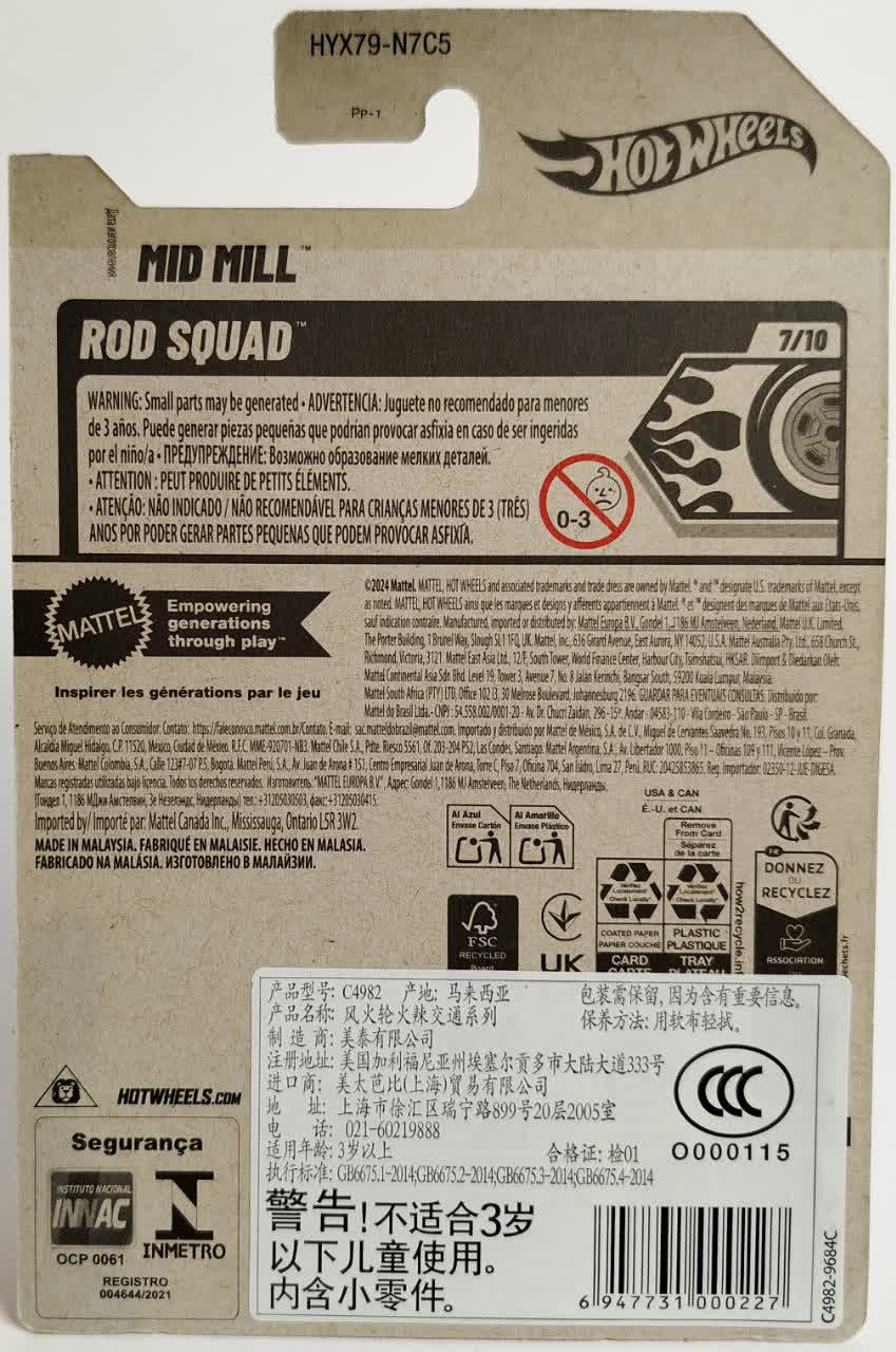 این مدل شماره ۷ از ۱۰ در سری Rod Squad است. این سری مخصوص خودروهای کاستوم، ماسل کارها و هات رودهایی است که با موتورهای تقویتشده و ظاهری دگرگون شده، آماده تسخیر خیابانها هستند. Mid Mill با طراحی عجیب و جذابش، یکی از اعضای برجسته این گروه است.