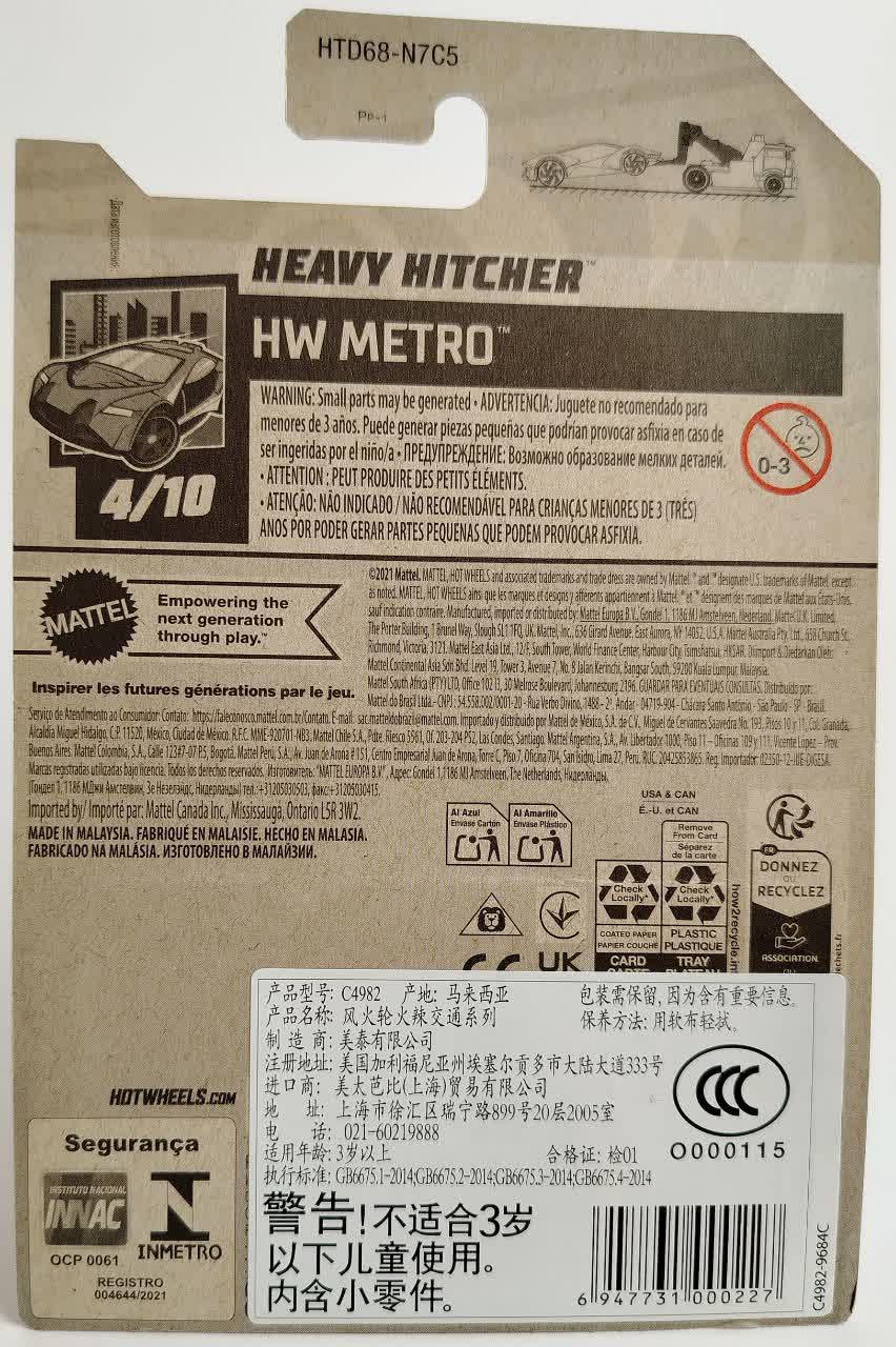این مدل شماره ۴ از ۱۰ در سری HW Metro است. این سری مخصوص خودروهای خدمات شهری مانند اتوبوس، تاکسی، ماشین زباله و یدککش است. Heavy Hitcher یکی از محبوبترین اعضای این خانواده است زیرا سناریوهای بازی خلاقانهای را برای کودکان ایجاد میکند.