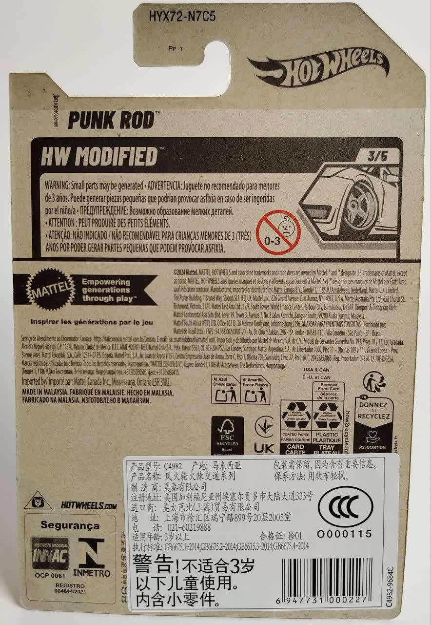 این مدل شماره ۳ از ۵ در سری HW Modified است. این سری به خودروهایی اختصاص دارد که به شدت دستکاری و تقویت شدهاند (Modified). پانک راد با کیت بدنه عریض و قطعات اضافی آیرودینامیک، دقیقاً در قلب این تعریف جای میگیرد. لوگوی این سری با طرح آچار و پیچگوشتی روی کارت، نماد گاراژهای تیونینگ است.