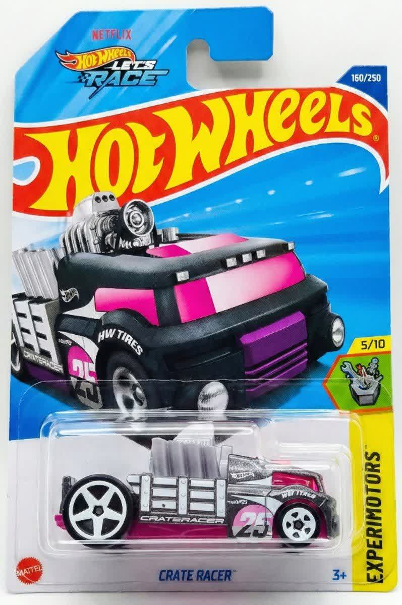 ماشین هات ویلز کریت ریسر Crate Racer با کد کلکسیونی ۱۶۰/۲۵۰ و به عنوان پنجمین مدل از سری ۱۰ تایی Experimotors در سال ۲۰۲۵ عرضه شده است.طراحی این ماشین به شکل یک کامیونت عجیب است که قسمت بار آن یک جعبه نقرهای بزرگ است و موتور عظیم مسابقهای از درون آن بیرون زده است. کابین راننده با رنگ مشکی و شیشههای صورتی نئونی، ظاهری سایبرپانک و فانتزی دارد. اگزوزهای بزرگ کرومی و نوشتههای گرافیکی "CRATERACER" و عدد "25" روی بدنه، حس سرعت و قدرت را منتقل میکنند. وجود لوگوی "Netflix Let's Race" روی بستهبندی نشان میدهد که این ماشین یکی از شخصیتهای ماجراجوی انیمیشن جدید هات ویلز است.