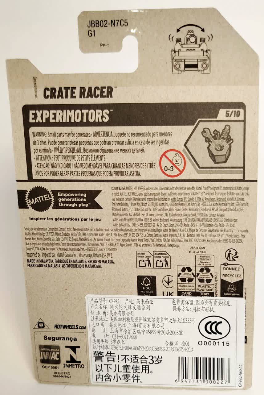 این مدل شماره ۵ از ۱۰ در سری Experimotors است. این سری معمولاً شامل ماشینهایی است که یک ویژگی خاص دارند. در مورد Crate Racer، طراحی باز و نمایان بودن اجزای داخلی موتور و ساختار "بدون بدنه" (Exposed Chassis)، ویژگی اصلی آن است که اجازه میدهد کودکان تخیل خود را درباره مکانیزم ماشین به کار بیندازند.