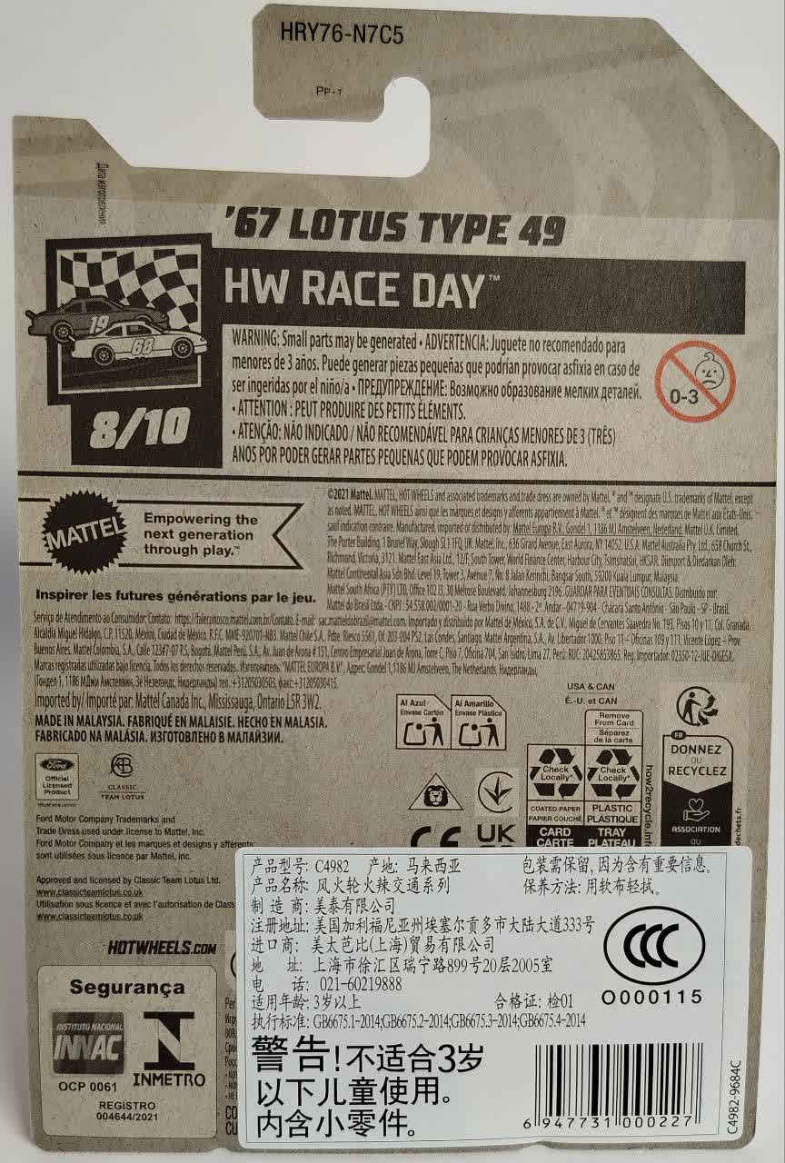 این مدل شماره ۸ از ۱۰ در سری HW Race Day است. این سری مخصوص خودروهای مسابقهای واقعی (Real World Racers) است که در پیستهای سراسر جهان افتخارآفرینی کردهاند. لوتوس ۴۹ با رانندگی اسطورههایی مثل جیم کلارک و گراهام هیل، جایگاه ویژهای در این لیست دارد. لوگوی پرچم شطرنجی در گوشه کارت، ماهیت مسابقهای این سری را نشان میدهد.