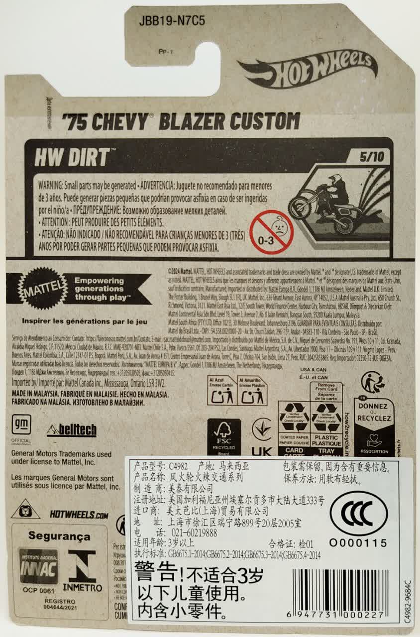 شورولت بلیزر K5 مدل ۱۹۷۵ یکی از محبوبترین خودروها برای علاقهمندان به طبیعتگردی و آفرود است. هات ویلز در سری HW Dirt، نسخهای "کاستوم" (Custom) از این خودرو را ارائه کرده که ارتفاع آن افزایش یافته (Lifted) و برای عبور از سختترین موانع آماده شده است.