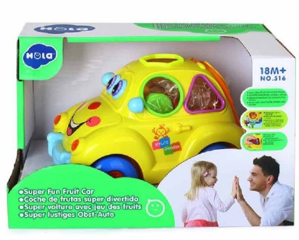 اسباب بازی ماشين فولکس میوه ای هالی تویز Hola Toys super fun fruit car 516 یک اسباب بازی موزیکال است. این ماشین فولکس از پلاستیک مقاوم ABS تهیه شده است بدنه این ماشین اسباب بازی دارای لبه های نرم و ایمن است که برای کودکان کاملا بی خطر میباشد. این ماشین جای گذاری اشکال هولی تویز موزیکال دارای افکت های نوری و صوتی ویژه است. چراغ های این اسباب بازی چشمک زن می باشد. دارای ۶ شکل هندسی رنگی است که داخل هرکدام یک نوع میوه قرار گرفته است و به یادگیری بیشتر کودک کمک میکند.