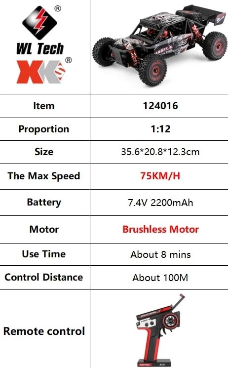 ماشین کنترلی WLTOYS 124016 از یک موتور بدون برس و بیسر صدا استفاده میکند که سرعت و مقاومت بسیار بالایی در مقایسه با دیگر موتورهایی دارد که در ماشینهای کنترلی بهکاررفتهاند. این موتور دارای راندمان بالا، سرعت تا 75 کیلومتر در ساعت. جنس بدنه باکیفیت بالا برای قدرتمندتر کردن اسب بخار، سریعتر از هر نوع موتور در دیگر ماشینهای کنترلی عمل میکند. از دیگر قابلیتهای موتور این ماشین کنترلی میتوان به عملکرد عالی، سیگنال کنترل پایدار، کنترل راحت و انعطافپذیر، دنده فرمان مستقل، فرستنده مستقل و مدولاسیون الکتریکی 60 آمپر مستقل اشاره کرد.