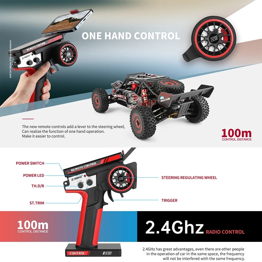این ماشین کنترلی از یک ریموت کنترل یا فرستنده با فرکانس 2.4 گیگاهرتز استفاده میکند که به شما این امکان را میدهد تا ماشین را بتوانید تا فاصله 100 متری نیز از راه دور کنترل کنید. همچنین این فرستنده 4 کاناله است و در زمان کنترل از راه دور هیچوقت دچار مشکل نخواهید شد.