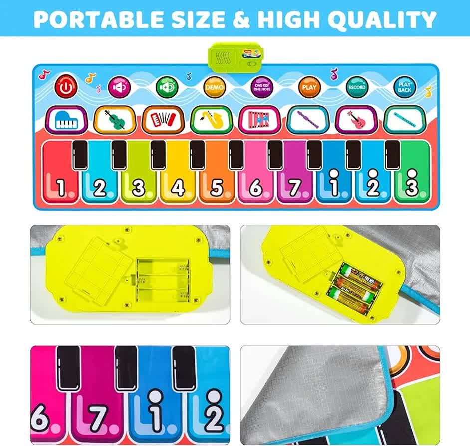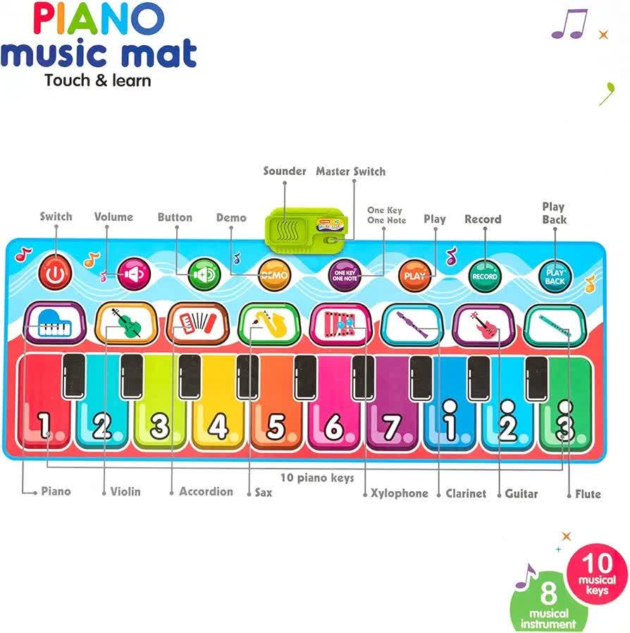 مت پیانو موزیکال Piano Music Mat D757-01A یک اسباب‌بازی هوشمند و تعاملی است که دنیای موسیقی را به شکلی لمسی و پرتحرک به کودکان معرفی می‌کند. این تشک موزیکال با طراحی رنگارنگ و کلیدهای بزرگ عددی، کودکان بالای ۳ سال را تشویق می‌کند تا با استفاده از دست‌ها و پاهای خود آهنگ بسازند و تحرک بدنی داشته باشند. این سفره موزیکال شامل ۸ صدای ساز مختلف از جمله ویولن، گیتار و ساکسیفون است که به رشد شنوایی و خلاقیت کودک کمک می‌کند. قابلیت ضبط (Record) و پخش مجدد ملودی‌ها، اعتماد به نفس کودک را در خلق اثر هنری تقویت کرده و محیطی شاد و آموزشی را در خانه فراهم می‌سازد.