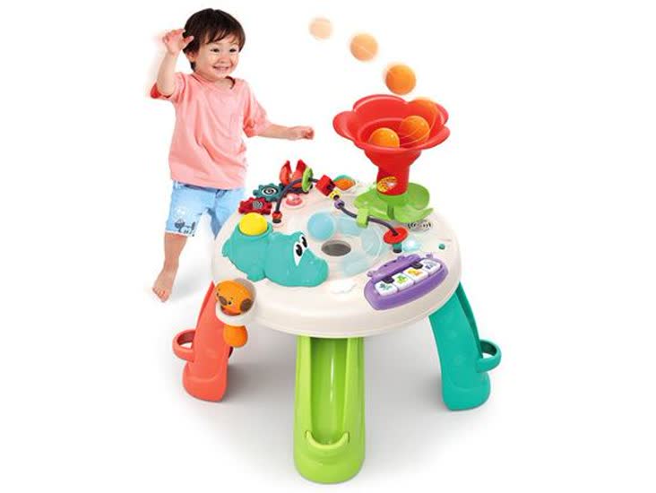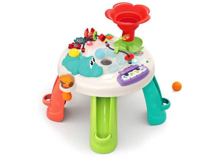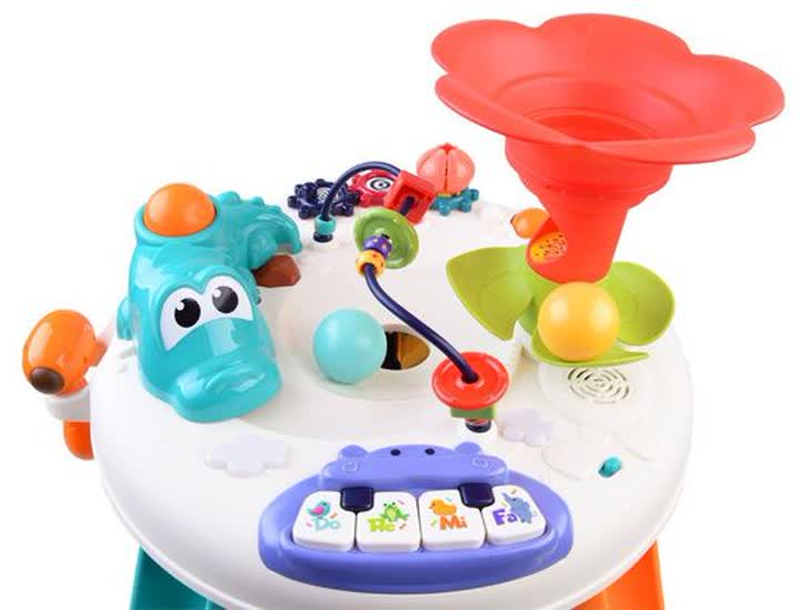 - سه بازی توپ تعاملی: میز شامل سه مسیر توپ داخلی است که کودک میتواند توپها را پرتاب کند یا بچرخاند تا تعامل فیزیکی و منظرۀ دید را تجربه کند.