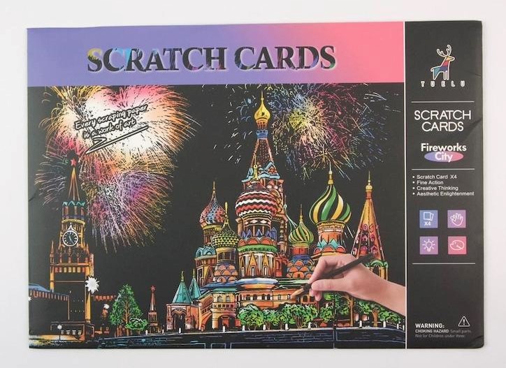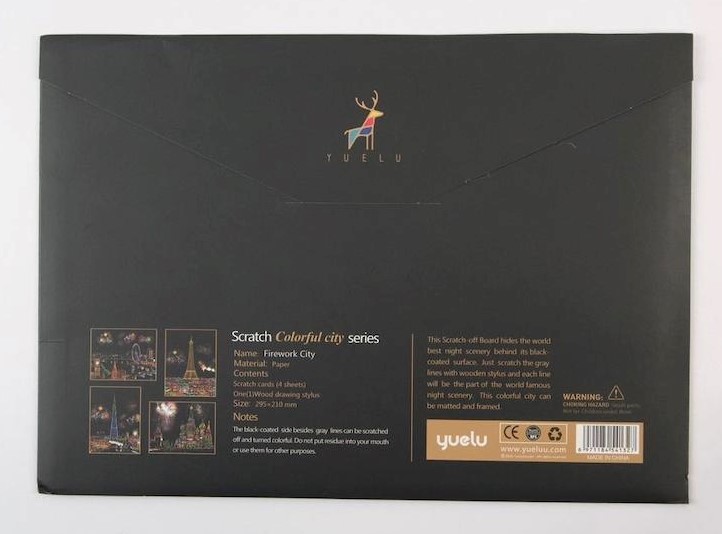 بسته اصلی نقاشی اسکراچ طرح آتش بازی شهری شامل 4 ورق طرح‌دار و ابزار خراش است.