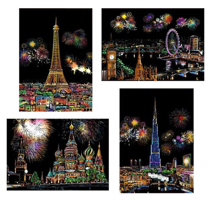 نقاشی خراشیدنی Scratch Firework City دارای طرح باشکوهی از آتش بازی های رنگارنگ است. نمای شهرها، ساختمان های زیبا و نورهای درخشان، همگی با ظرافت و طراحی دقیق روی صفحه نقش شده‌اند. کشف تدریجی این تصویر همان چیزی است که این سرگرمی را آرام‌بخش، لذت‌بخش و اعتیادآور می‌کند.