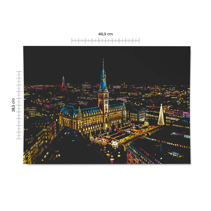 نقاشی خراشیدنی Scratch Humburg Germany دارای طرح باشکوهی از منظرهی هامبورگ آلمان است. برجها، سازههای معماری، پلهای شهری و نورهای درخشان، همگی با ظرافت و طراحی دقیق روی صفحه نقش شدهاند. کشف تدریجی این تصویر همان چیزی است که این سرگرمی را آرامبخش، لذتبخش و اعتیادآور میکند.