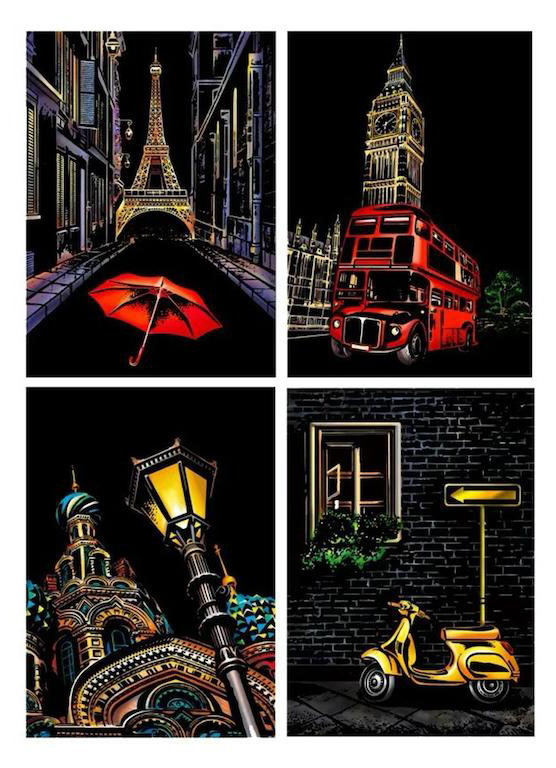 بسته اصلی نقاشی اسکراچ طرح گوشه خیابان شامل 4 ورق طرحدار و ابزار خراش است.