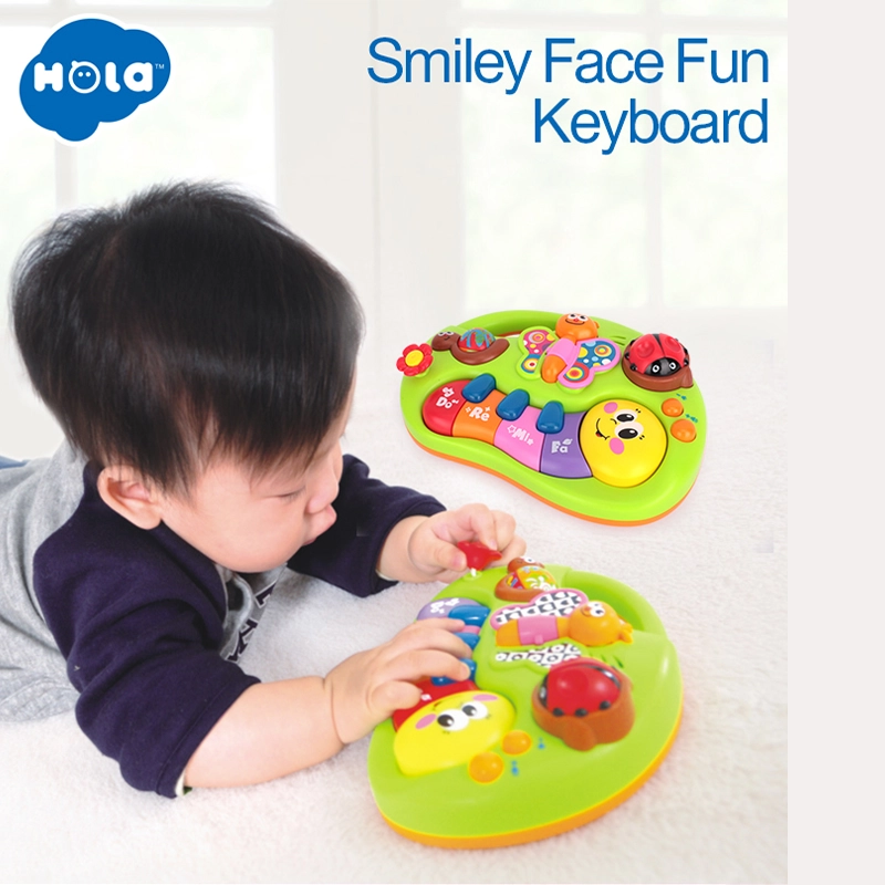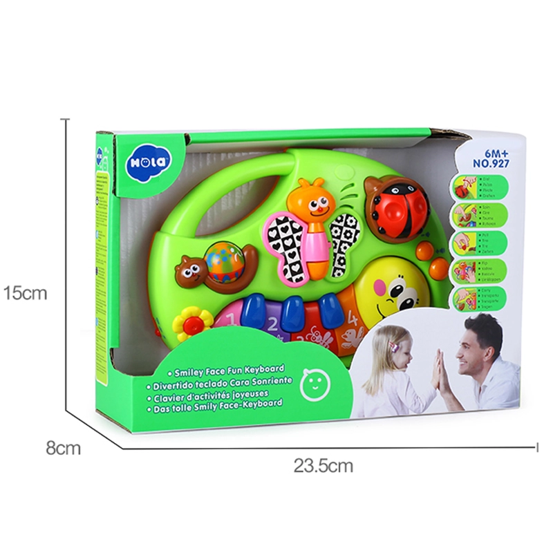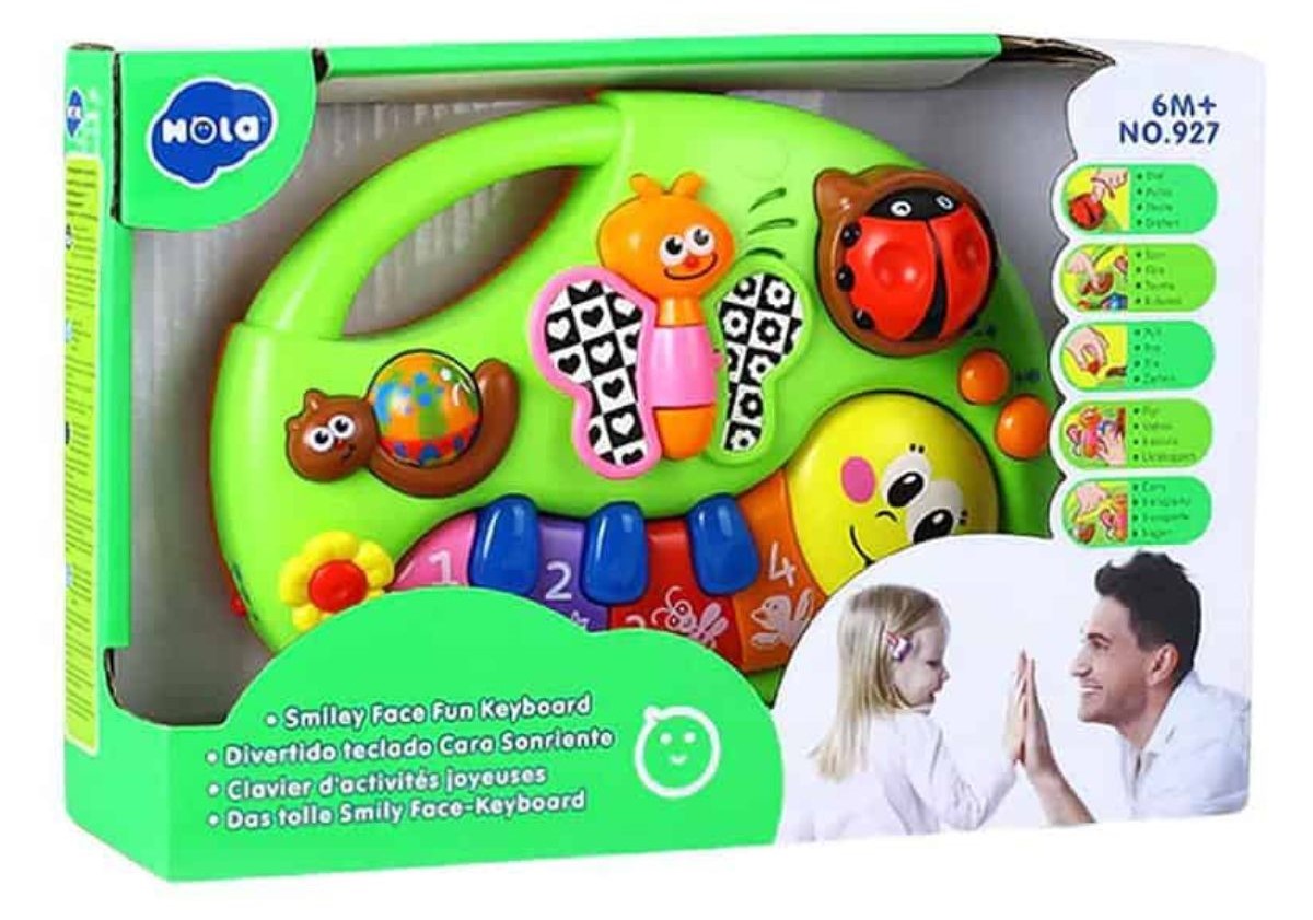 پیانو موزیکال طرح حشرات Hola Toys smiley face fun keyboard 927 یک سرگرمی عالی و آموزشی برای نوزادان و کودکان 6 ماه به بالا است. این اسباب بازی موزیکال به دلیل ابعاد کوچکش به راحتی در دست بچه ها جا میشود و همین امر باعث لذت بخش تر شدن بازی با ایناسباب بازی میشود. این اسباب بازی موسیقی شامل دکمه هایی متنوعی برای تنظیم صدای خروجی میباشد، همچنین نام هر نت روی دکمههای ارگ نوشته شده است. از امکانات این اسباب بازی میتوان به ایجاد صدای حیوانات اشاره کرد که با موسیقی پخش خواهد شد و یا تنظیم در حالت قصه گویی که حیوان شروع به گفتن داستان میکند.