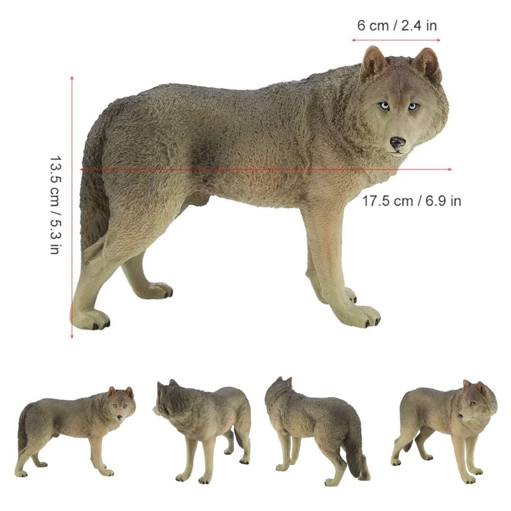 این فیگور با دقت به جزئیات بدن گرگ خاکستری از جمله بافت پشم، پنجهها، دندانها و حالت چشمها طراحی شده است. رنگآمیزی خاکستری با سایههای طبیعی، جلوهای زنده به این ماکت داده است.
