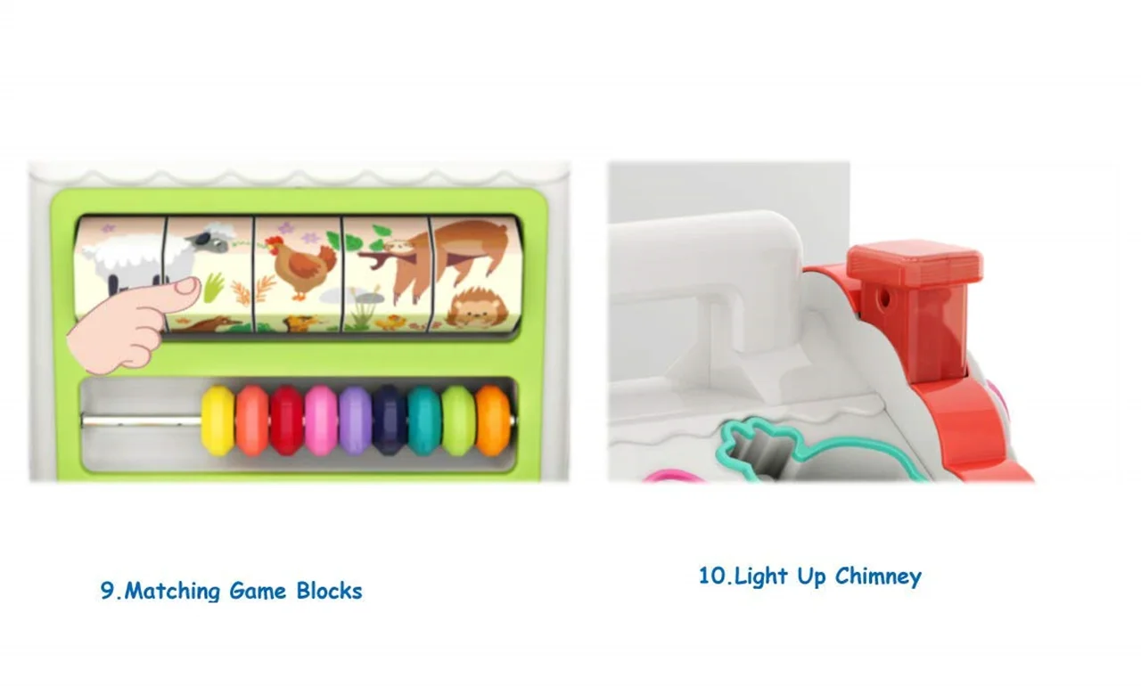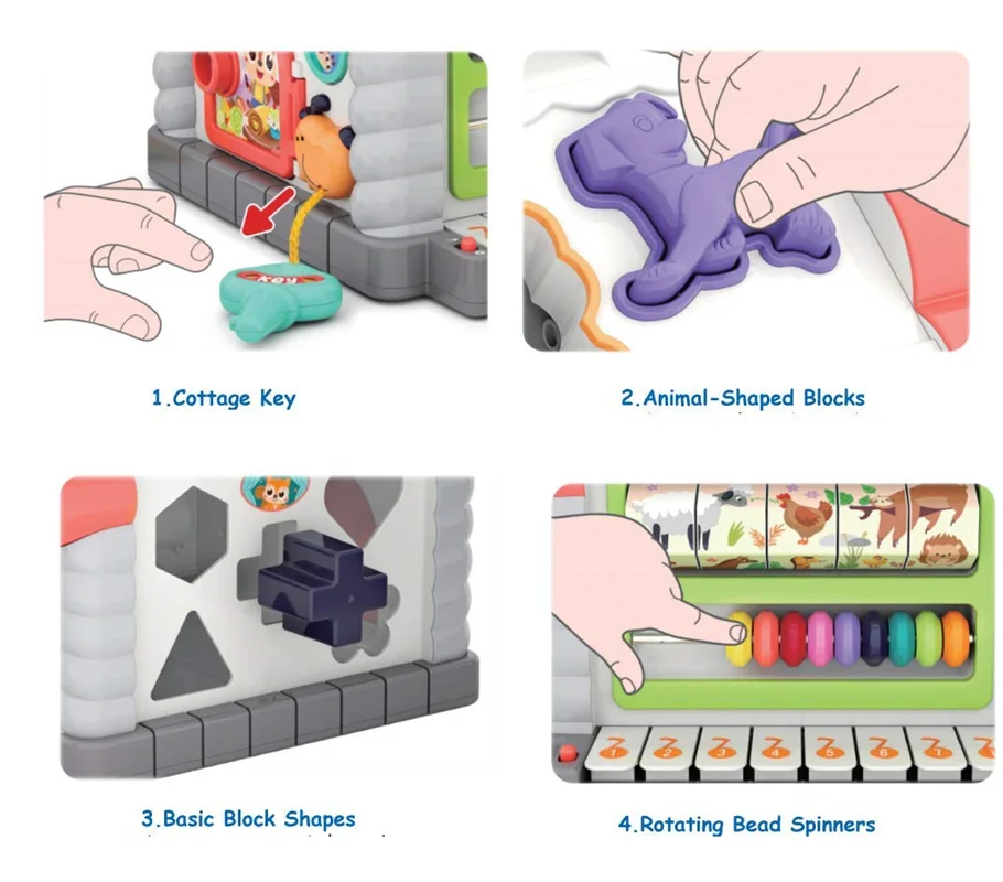 به عبارتی دیگر با کلبه آموزشی می توان دو بازی متنوع را انجام داد. در یکی از این بازی ها کودک می تواند از جایگذاری شکل های مختلف لذت ببرد. در این بخش، کودک باید اشکال و حیوانات مختلف را در مکان مناسب خود قرار دهد و بدین صورت می تواند اسم آنها را هم یاد بگیرد. همچنین، در پشت کلبه دریچه ای قرار دارد که کودک باید دست خود را داخل آن کند و اجزای اسباب بازی را خارج کند. این بخش می تواند قدرت حدس زدن کودک را به چالش بکشد.