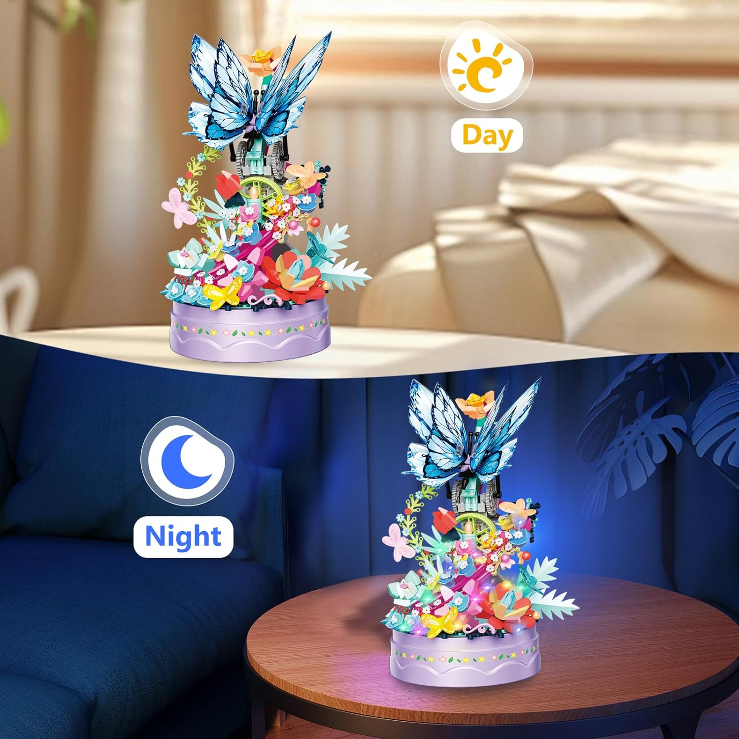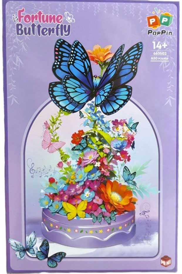 گلها با رنگهای گرم و زنده طراحی شدهاند و پروانهها با جزئیات دقیق، جلوهای واقعی و لطیف ایجاد میکنند. قطعات بهگونهای کنار هم قرار میگیرند که ساختار نهایی کاملاً سهبعدی بوده و قابلیت نمایش روی میز، شلف یا داخل گلدان دکوراتیو را دارد.