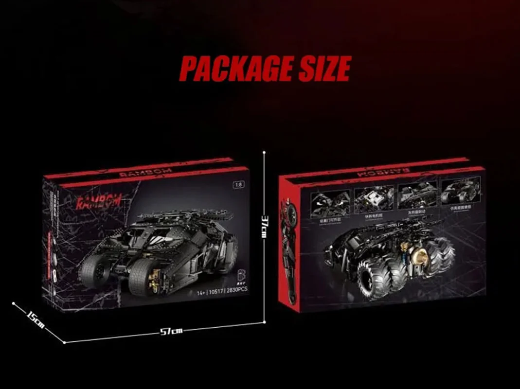 محصول لگو بتمن رمبوم مدل ۱۰۵۱۷ (Batmobile Rambom 10517)، شامل ۲,۸۳۰ قطعه دقیق و با کیفیت است که به مقیاس ۱:۸ ساخته شدهاند. بدنهٔ این Batmobile با طراحی آیرودینامیک، رنگ مشکی مات و عناصر خاکستری و نقرهای ترکیب شده است تا ظاهری قدرتمند، ترسناک و الهامگرفته از فیلمها و کمیکهای بتمن داشته باشد. جلوی مدل دارای خطوط شکسته، محافظتکنندهها، و تهویهها است؛ عقب آن با جزئیات موتور و خروجی اگزوز برجستهای طراحی شده است. چرخها رواناند، و کابین بازشونده امکان مشاهدهٔ داخلی را فراهم میکند.
