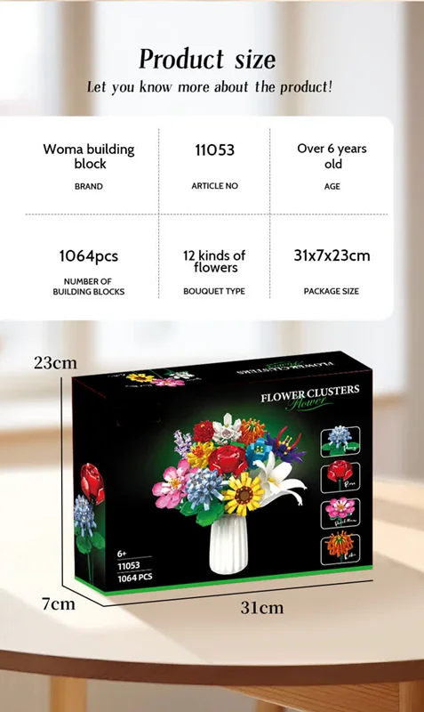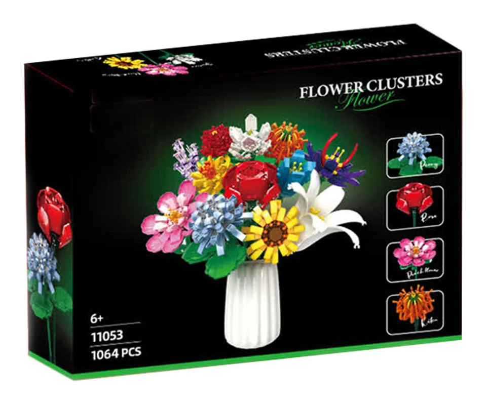 مجموعه لگو گلدان گل Flower Clusters مدل ۱۱۰۵۳ با ۱۰۶۴ قطعه، شامل ۱۲ نوع گل متنوع است؛ گل‌هایی با رنگ‌‌های زنده و طراحی حلقه‌به‌حلقه یا لایه‌به‌لایه که هر رنگ و طرح، جذابیت خاص خود را دارد. رنگ‌های گل‌ها شامل قرمز، صورتی، زرد، بنفش و سبز خوب برای ساقه‌ها و برگ‌هاست. ابعاد هر گل پس از ساخت می‌تواند متفاوت باشد بسته به ارتفاع ساقه‌ای که انتخاب می‌کنید.