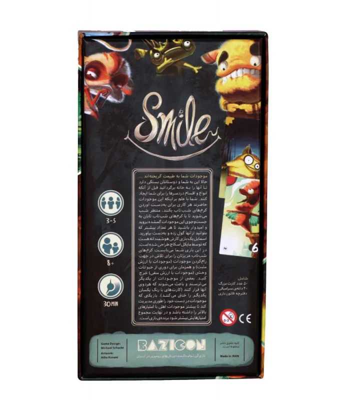 بازی فکری لبخند یک بازی کارتی جذاب و سرگرمکننده برای ۳ تا ۵ بازیکن است که شما را به یک شب ماجراجویانه در جنگل میبرد. در این بازی، شب فرا رسیده و حیوانات دستآموز شما از حصارها و پرچینهای خود گریختهاند. برای برگرداندن آنها، باید از کرمهای شبتاب نورانی استفاده کنید.در هر نوبت، بازیکنان به نوبت تلاش میکنند تا با کمک کرمهای شبتاب، حیوانات خود را به لانههایشان ترغیب کنند. اما باید مراقب باشید، زیرا حیوانات وحشی نیز به نور این کرمها attracted هستند و حضور آنها میتواند منجر به کسب امتیازات منفی برای شما شود. بنابراین، انتخابهای هوشمندانه و استراتژیک ضروری است تا از یکسو حیوانات مفید را جلب کنید و از سوی دیگر از افت امتیاز جلوگیری نمایید.بازی لبخند به شما این امکان را میدهد که فکر و برنامهریزی کنید و در پایان، به عنوان برنده از بازی خارج شوید. آیا آمادهاید تا با لبخند بر لب، به ماجراجویی در جنگل بروید و لشگری از حیوانات بازیگوش را به دوش بکشید؟ این بازی نه تنها سرگرمکننده است، بلکه مهارتهای اجتماعی و استراتژیک شما را نیز به چالش میکشد.