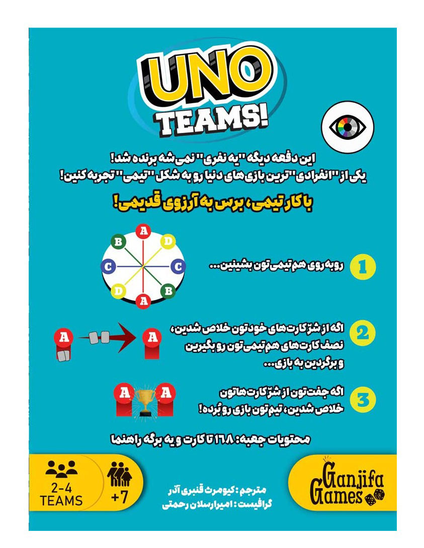 بازی فکری اونو تیمی Uno Teams بازطراحی خلاقانهای از یکی از انفرادیترین بازیهای کارتی دنیاست. در این نسخه، بازیکنان دیگر تنها برای خودشان بازی نمیکنند، بلکه باید با همتیمیشان هماهنگ شوند تا مسیر پیروزی را هموار کنند.
